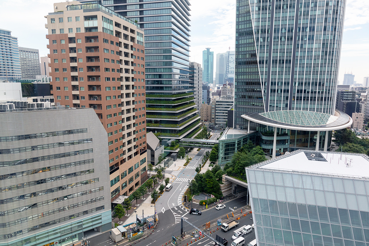 ステーションタワー7階から東方向を眺めると、前方には3棟の超高層ビルが建っています。中央が「虎ノ門ヒルズ 森タワー」、その左側が「虎ノ門ヒルズ ビジネスタワー」、そして右側が「虎ノ門ヒルズ レジデンシャルタワー」です。