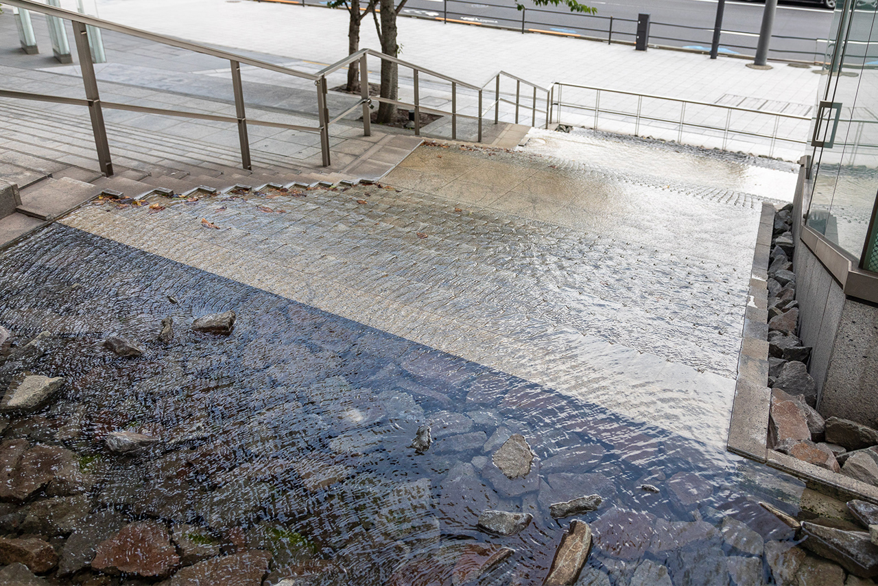 さらに、桜川の流れ跡に沿って森タワーの新虎通り側に移動すると、階段状に流れる滝のような水辺❷が!