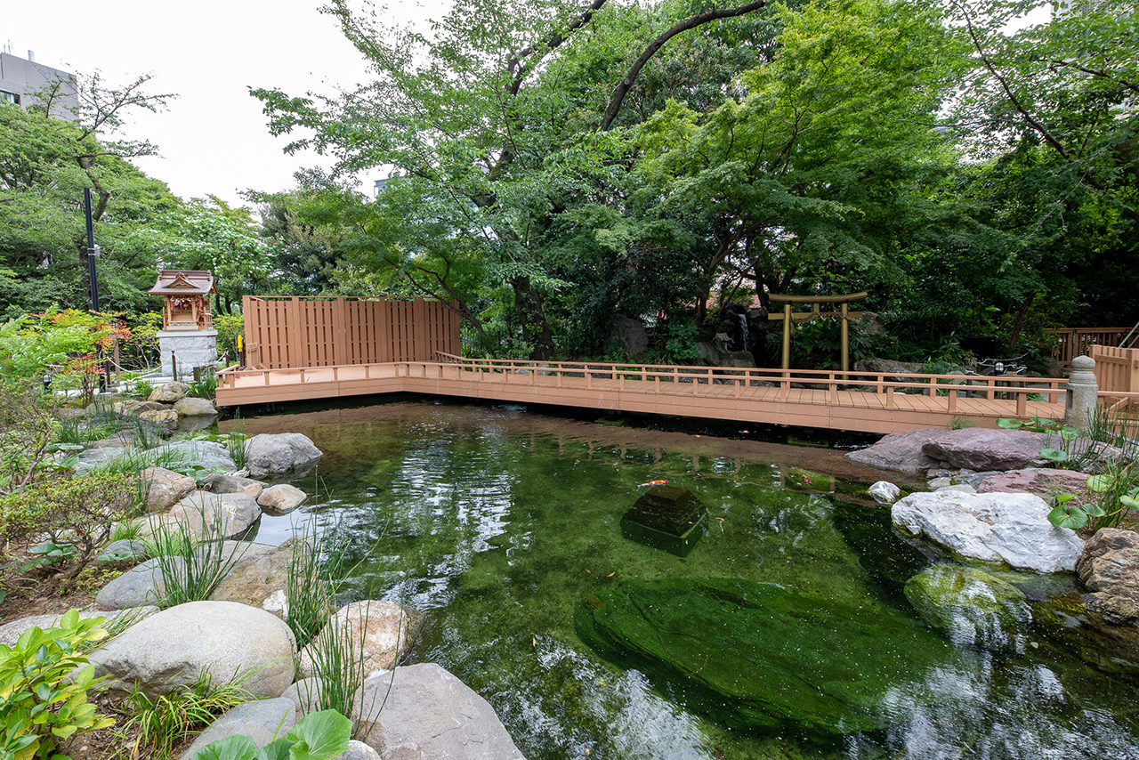 2023年には境内が再整備され、以前からあった池には新たに橋と水上舞台が設えられ、水辺でのコンサートなども行われているそう。神様により近いところでお詣りしたいという参拝者の要望に応えて、本殿脇に、太郎坊社、福寿稲荷社、大黒天社という末社も設けられました。毎月24日が神社の縁日で、その日にマルシェが行われることもあるそうです。