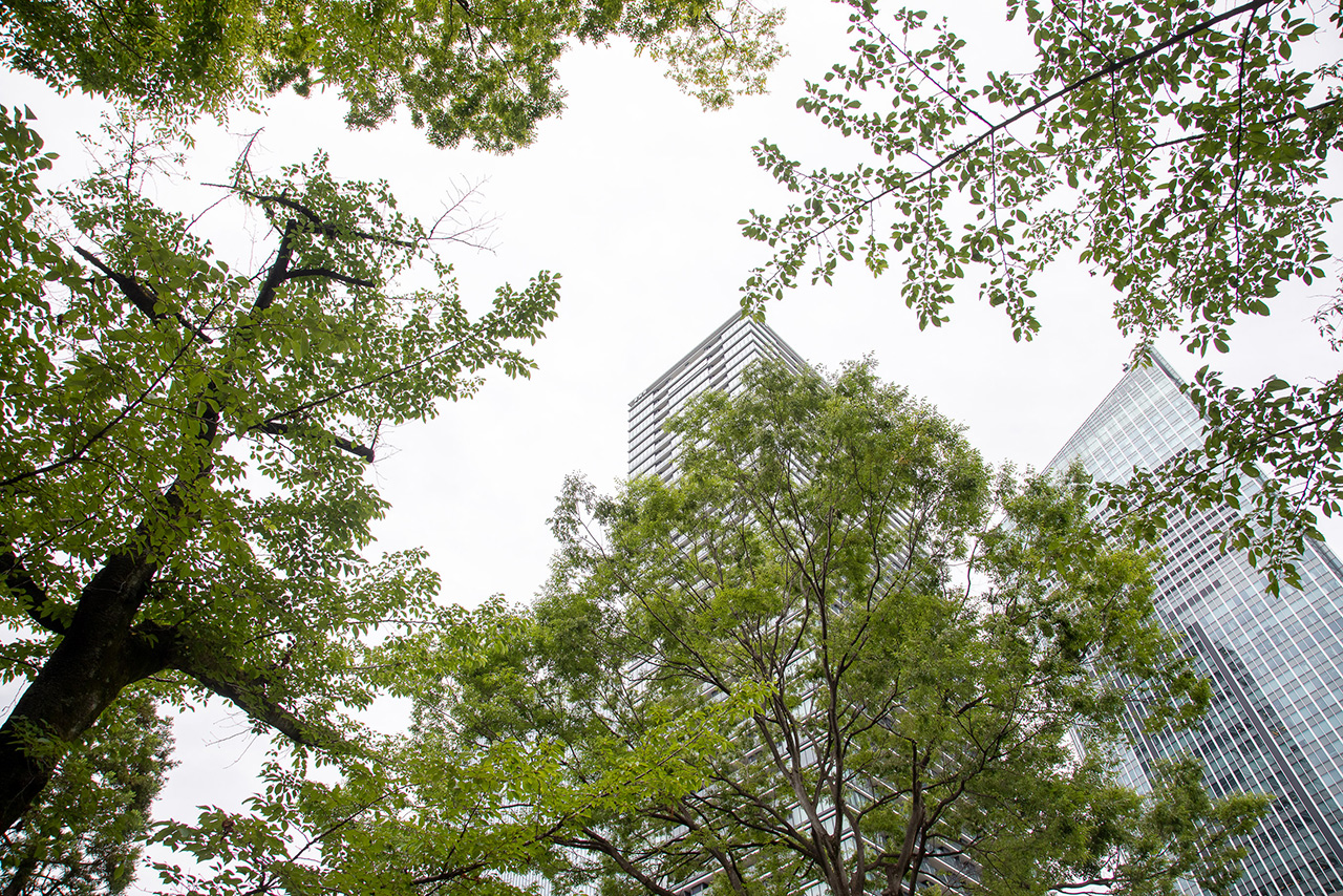 池のほとりから空を仰ぐと、木々の間から虎ノ門ヒルズのビル群が見えます。ヒルズで働く人、住む人たちも、この神社を憩いの場所としているようです