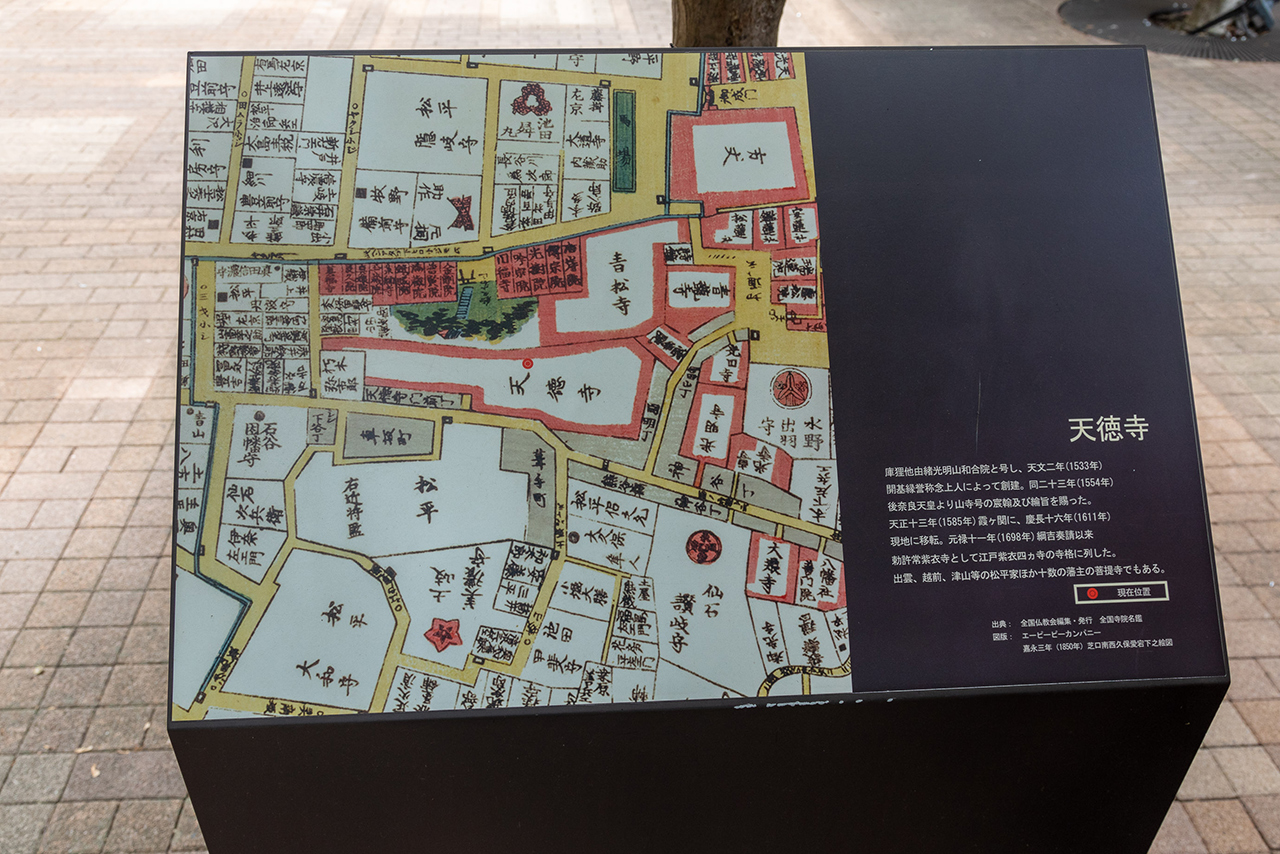 その道端で見つけたのは、天徳寺に関しての解説板。江戸時代の地図が掲載されていて、このあたりが江戸期からの寺町で、周辺には大名屋敷が多かったことがわかります。