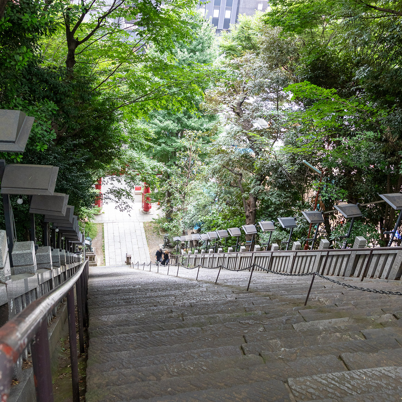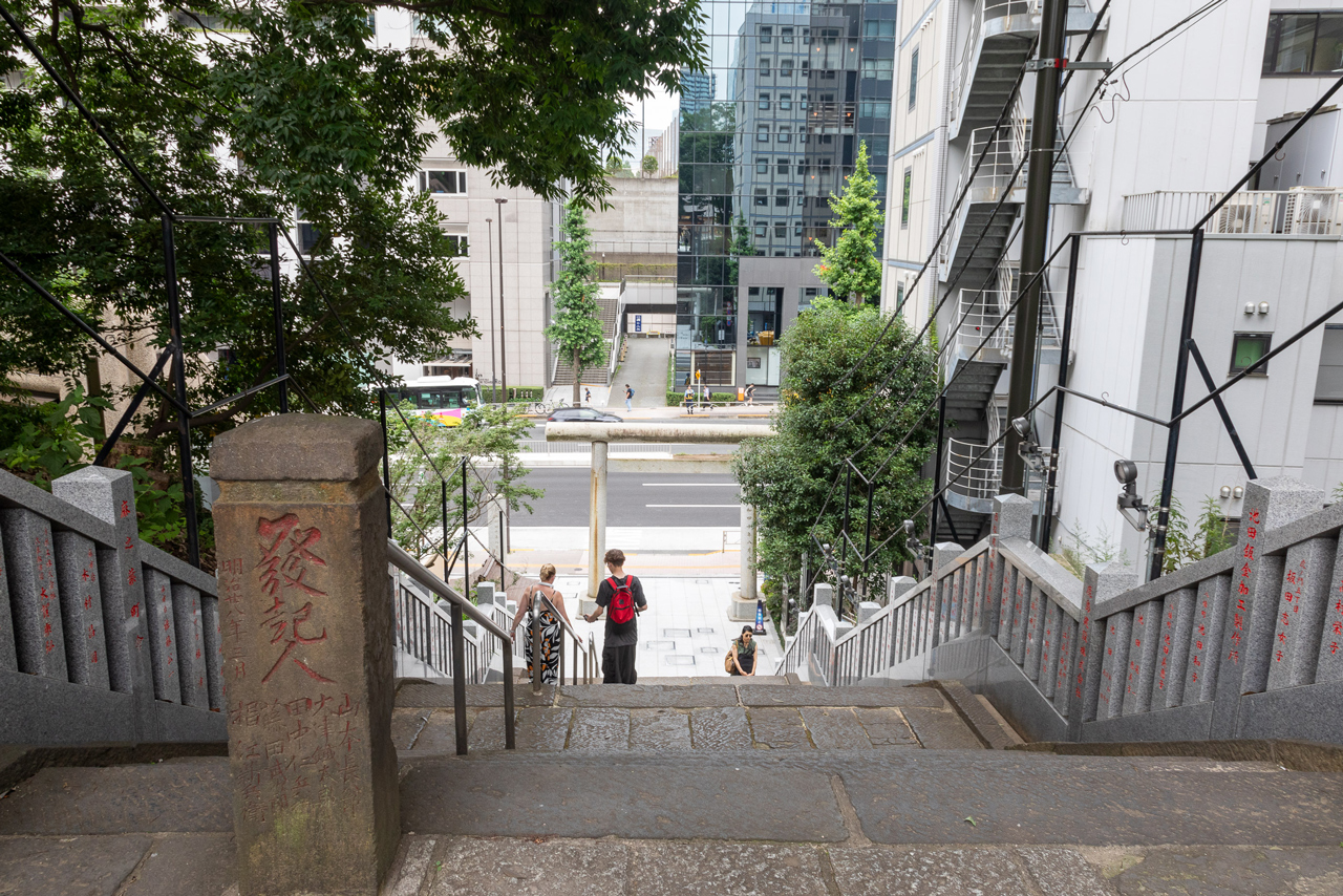 境内から桜田通り側の参道階段を眺めると、ここもかなり急角度です。石段は寛政9(1797)年に造られたものだそう。階段脇の玉垣には、虎ノ門桜川町、麻布我善坊町などの旧町名を冠する町会の氏子さんたちのお名前が刻まれています