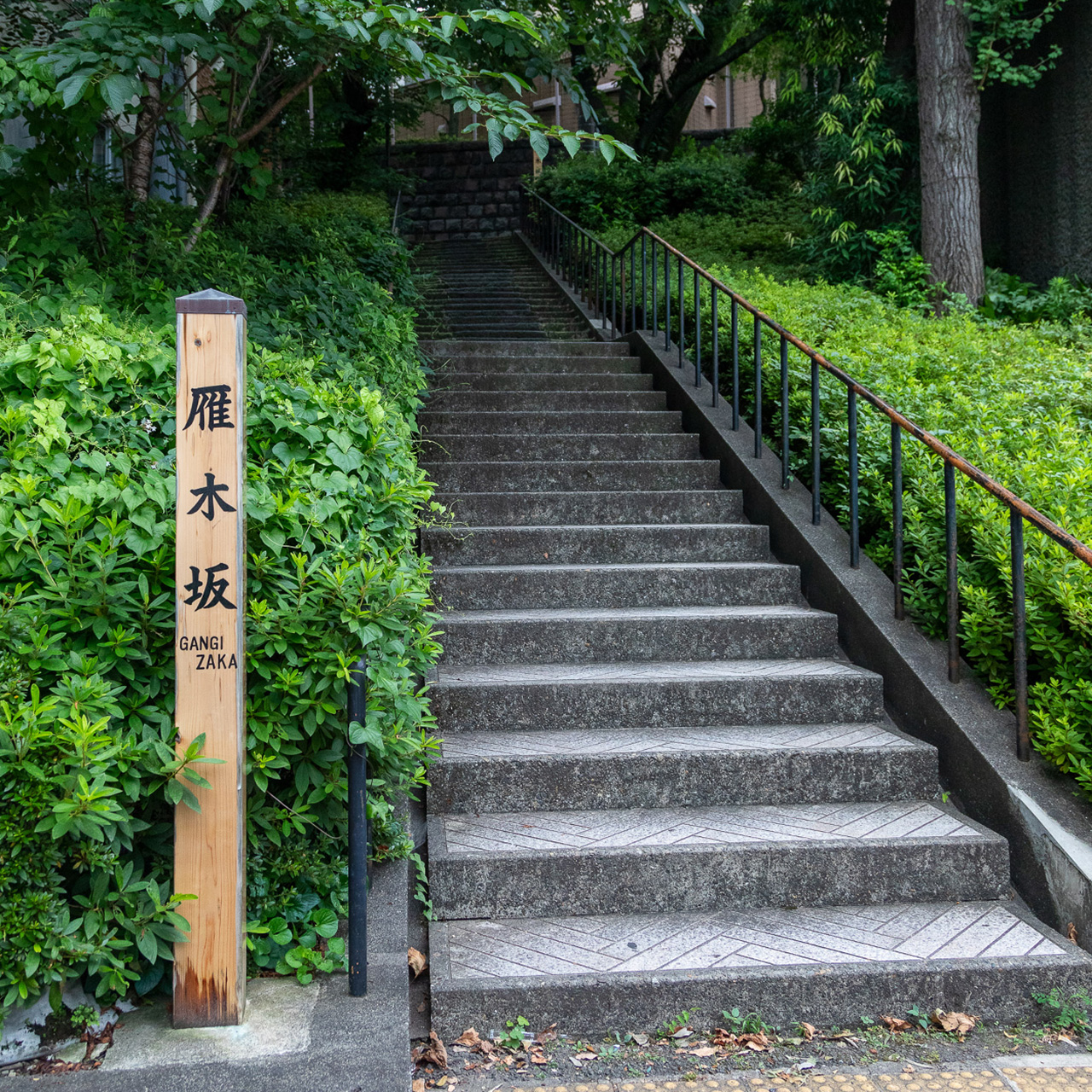 西久保八幡神社門前❻から桜田通りを飯倉交差点方面である南に向かい、交差点手前の道を東に曲がると、その先に見えるのが雁木坂❼です。階段状の坂ですが、ここの風景は再開発以前から変わっていません。雁木とは、空を飛ぶ雁の列が、斜めででギザギザしているように見えることを表現したものですが、木材をはしご状、または階段状に組んで坂道を登りやすくした坂を言い表しているようです。