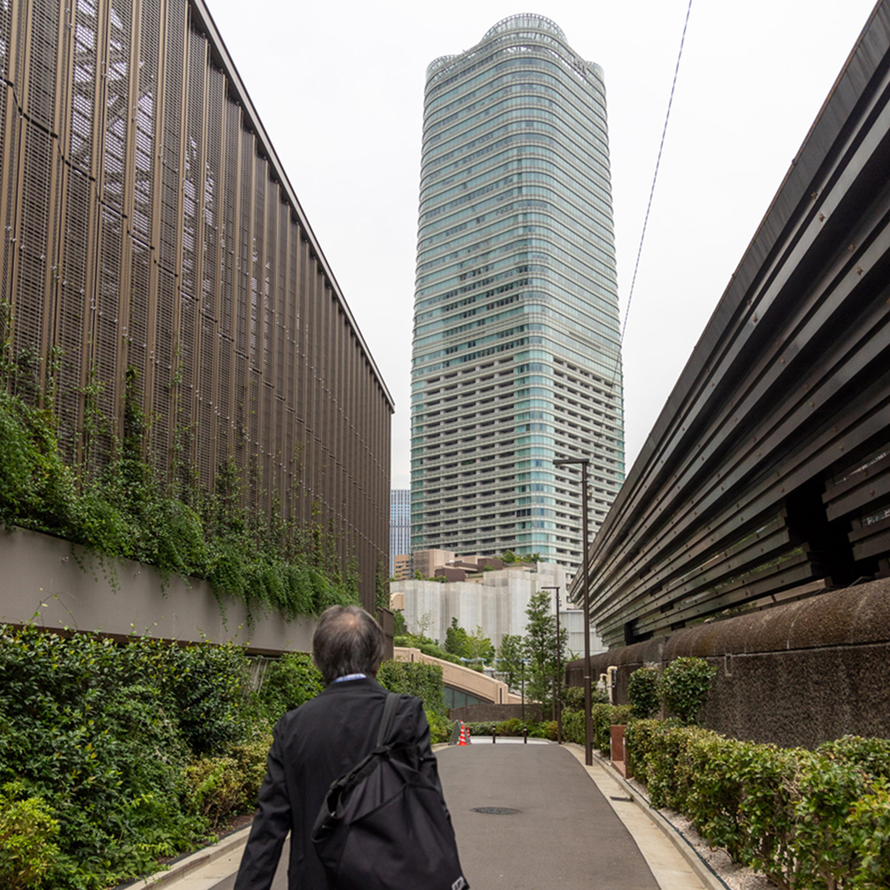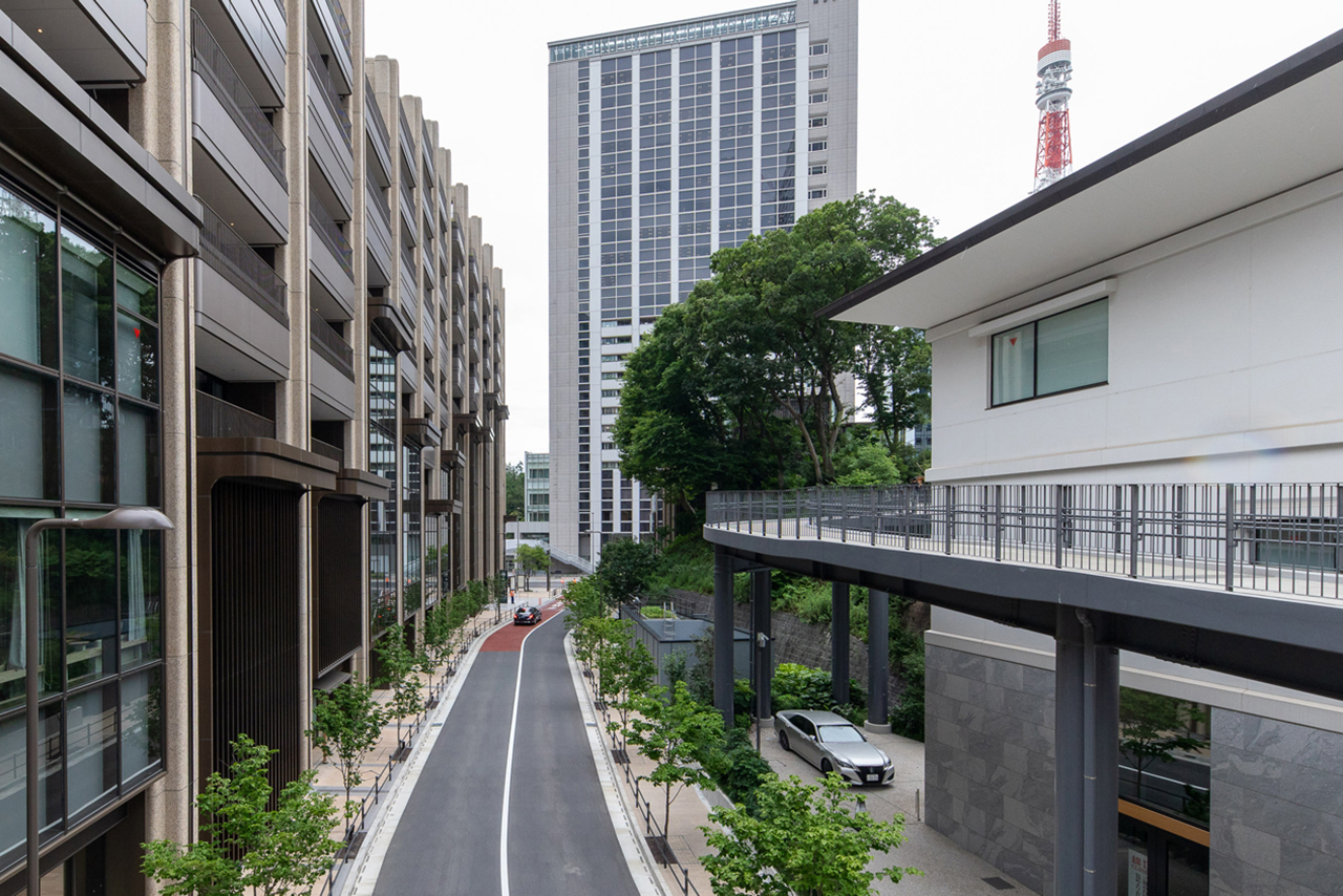 雁木坂を上りきって北方向に歩くと、正面に麻布台ヒルズの北側にある、仙石山森タワーが見えてきます。