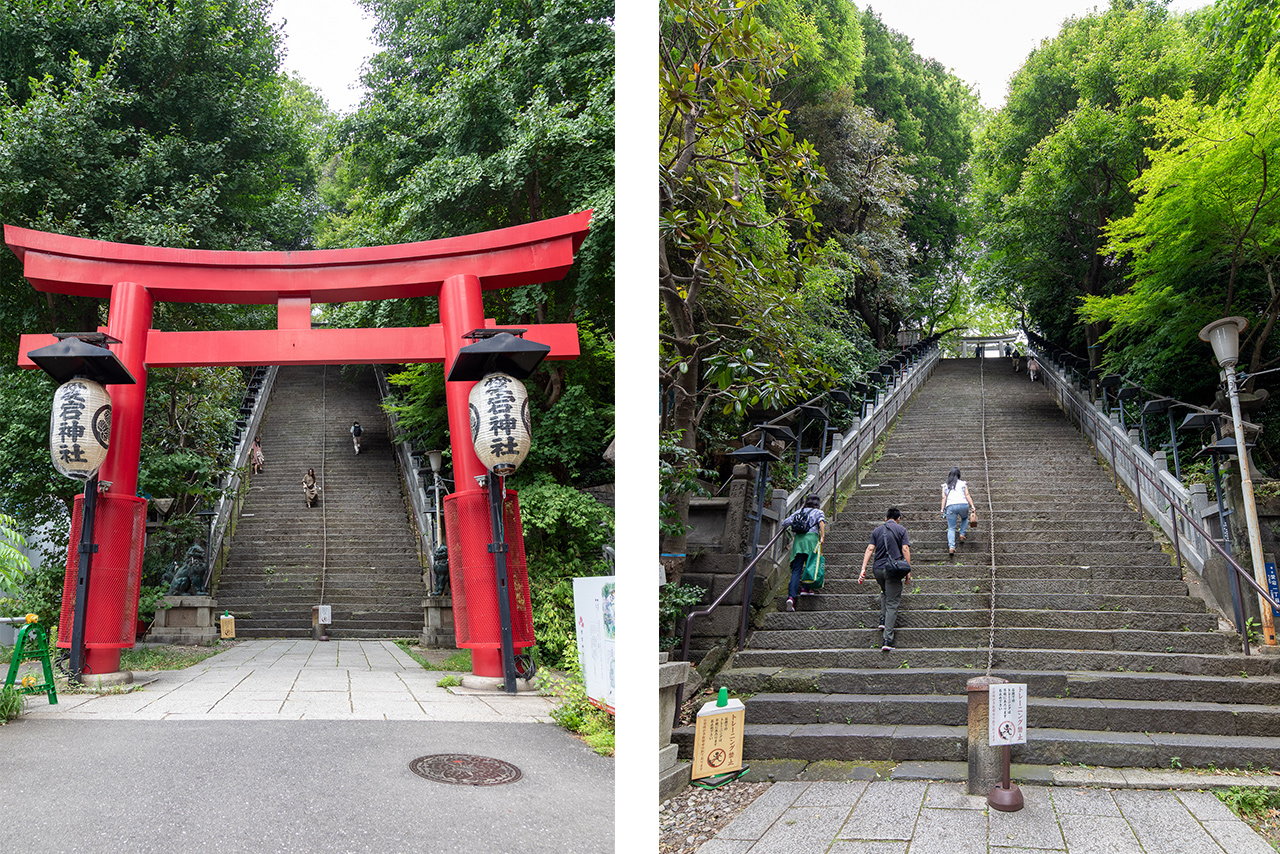 鳥居の向こうには急角度の“出世の石段”。1603年の神社創建時に造られたものということで、一段一段の高さも不規則で、踏み板の幅も微妙に異なる。86段を上りきると標高25.7メートルの山頂にたどり着く