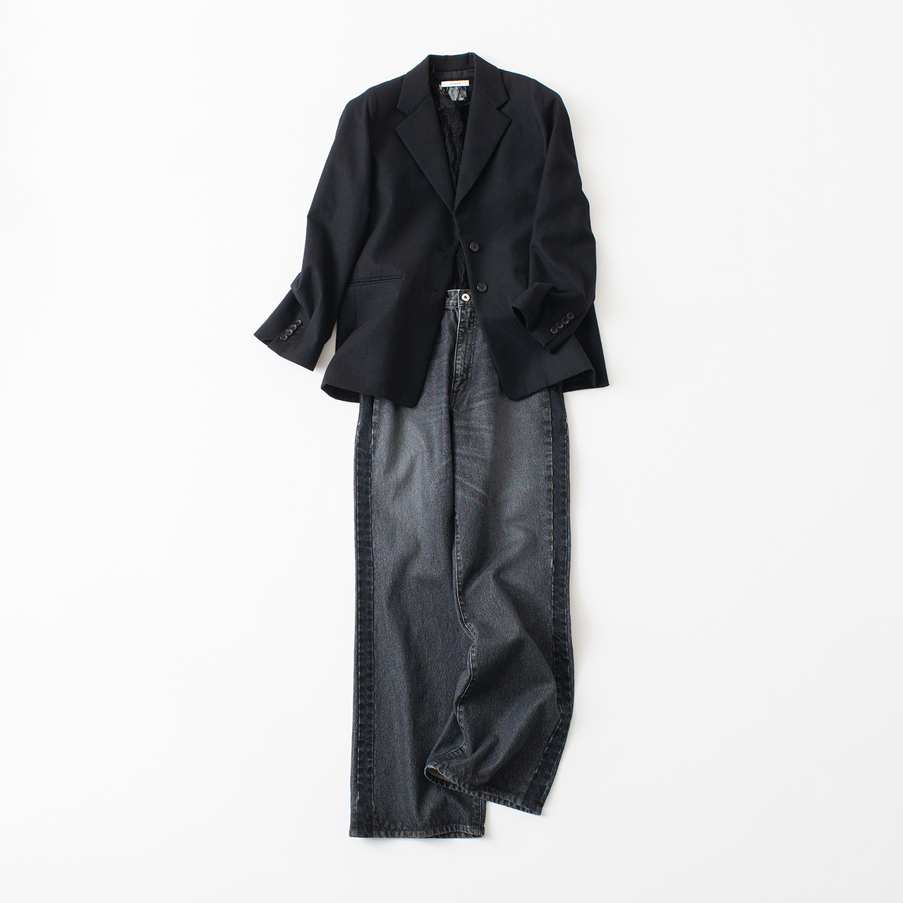 シンプルなジャケットにデニムの組み合わせは、定番のスタイルですよね。昔のジャケット選びの基本は、ジャストサイズが王道ルール。肩や袖がピッタリと合っているジャストサイズを着ることこそが美しいジャケットの着こなしでした。確かに身体にフィットしたジャケットはスタイルを良く見せてくれます。ですが、今は逆にそれが諸刃の刃。スタイル重視のバランスを求めると、ひと昔前の人になってしまいます。王道もアップデートされているのです。ヴィンテージ風のワイドデニムに、オーバーサイズ気味のジャケットを合わせ、インナーにレースを覗かせる。袖を捲ってカジュアルに着こなしてもいいです。きっちりと仕上げ過ぎず、少し崩れているぐらいが今のトレンド。バランスひとつで、相当なこなれ感が出てきます。今のバランスを手に入れるため、使える定番を買い替える意味があるのです。
