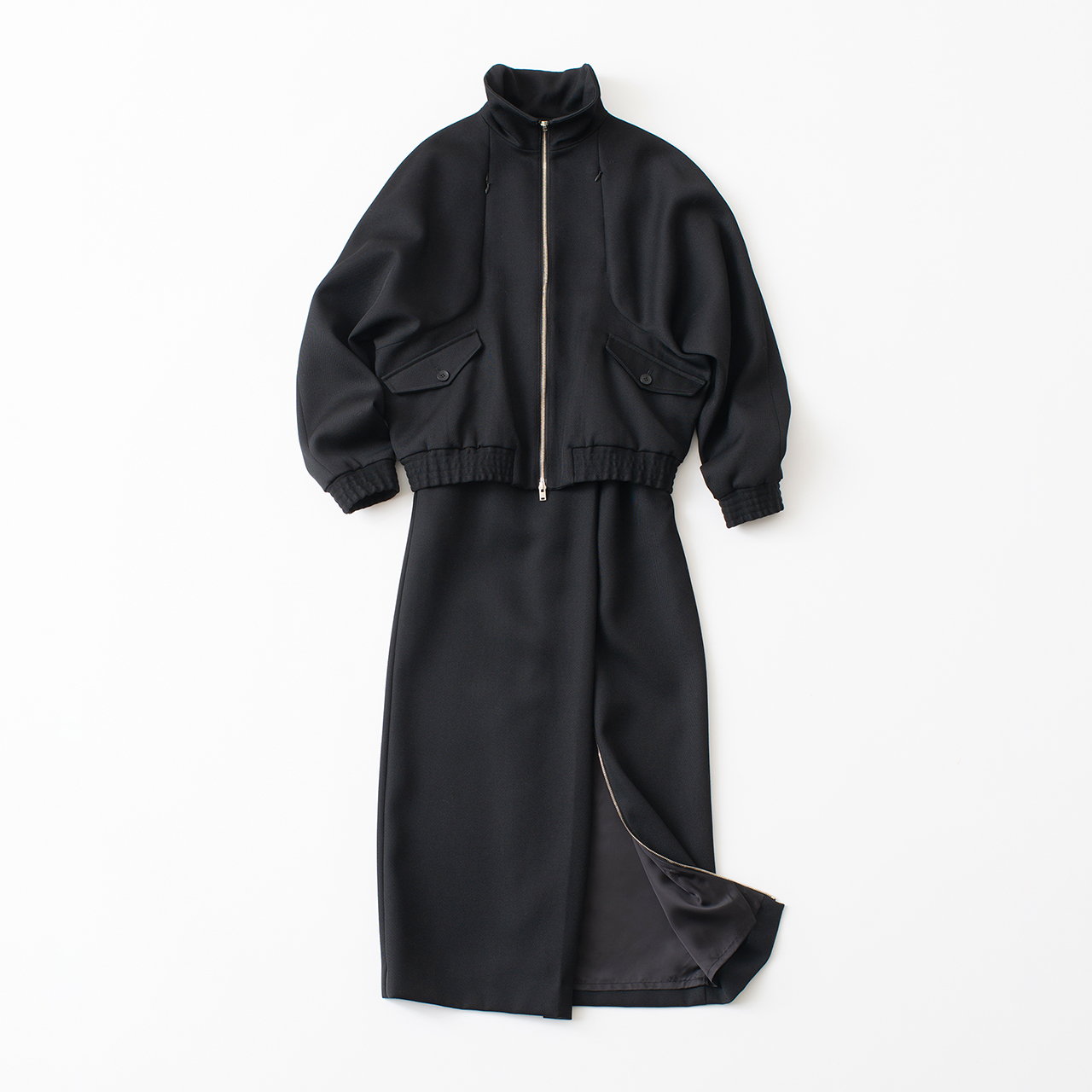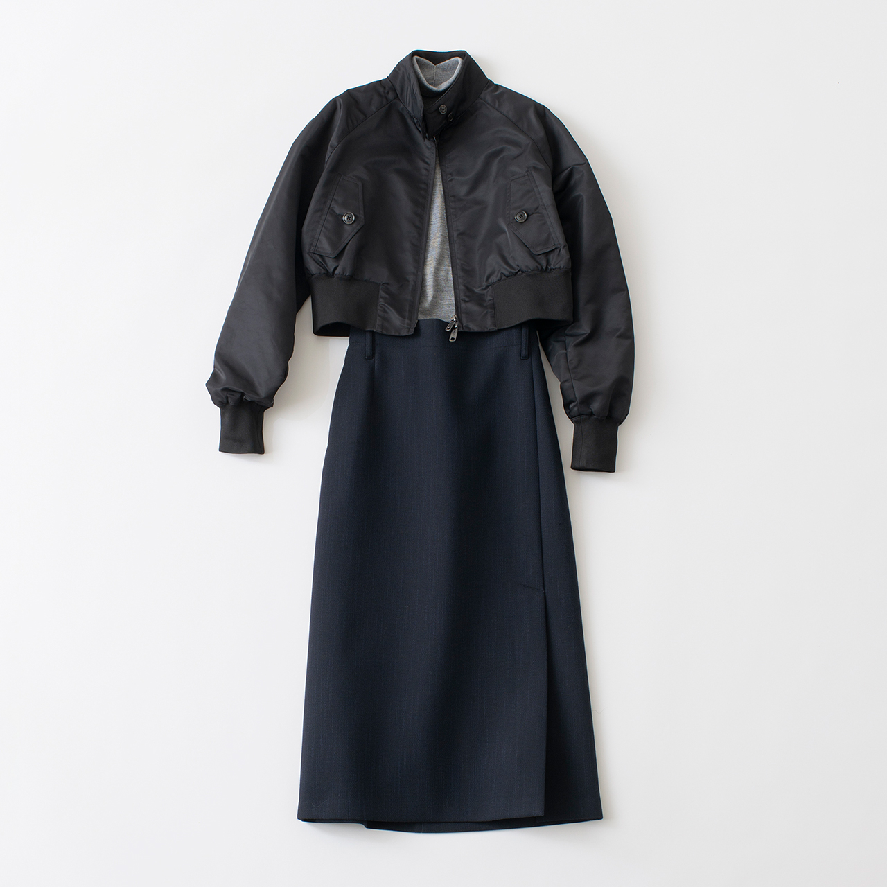 ウルトラショート丈のナイロンブルゾン。スリット入りの上品なロングスカートに合わせ、エレガントに着こなしたい。ショートブルゾン¥77,000(コラム)、タートルネックトップ¥66,000(エストネーション ザ ファースト)、スカート¥55,000(コラム/以上エストネーション/六本木ヒルズ ヒルサイド1F・2F)