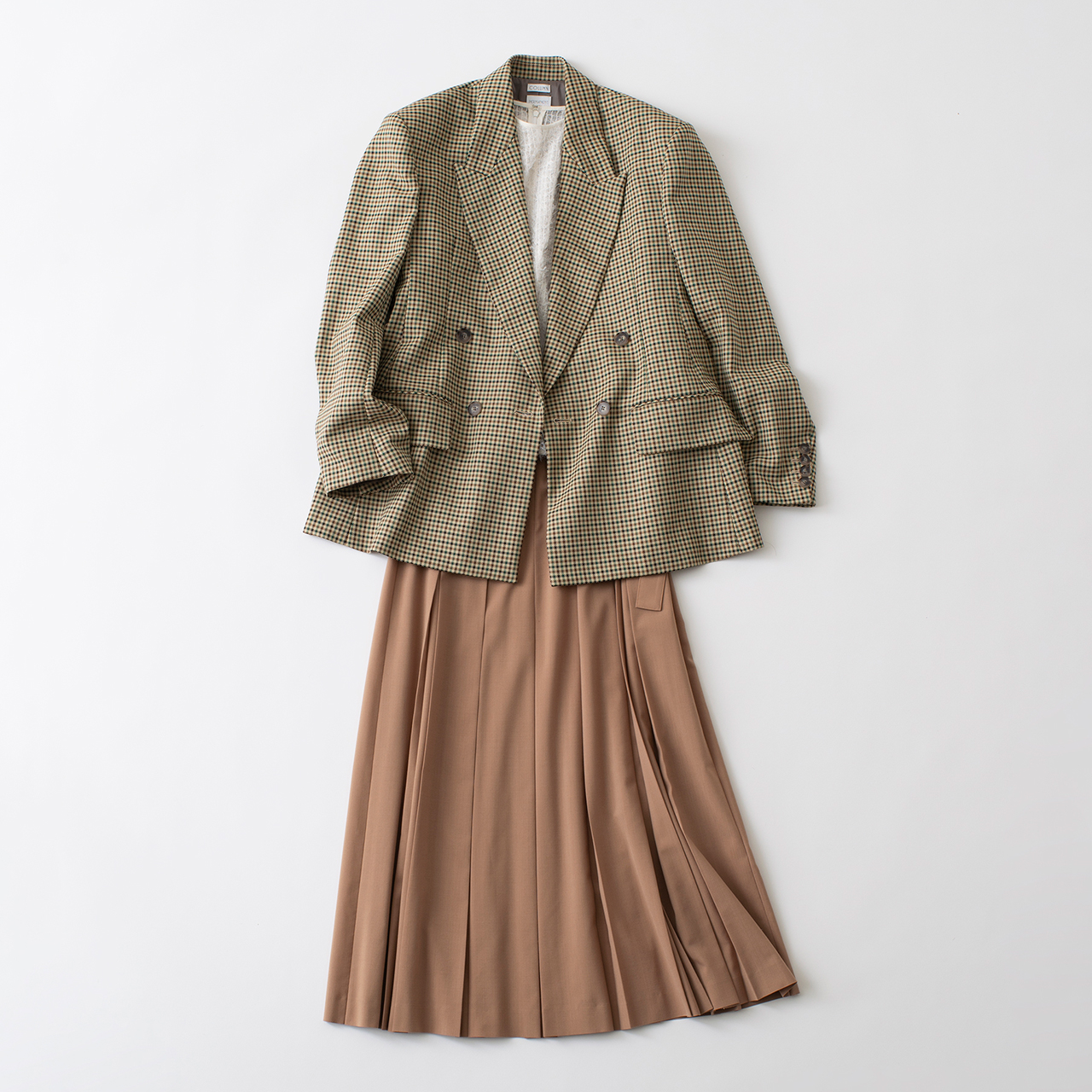 クラシカルな印象が漂うガンクラブチェックのメンズライクなジャケット。シアーなインナーとフルレングスのプリーツスカートなど、合わせるアイテムは思いっきりフェミニンにまとめて。ジャケット¥77,000(コラム)、シアートップ¥30,800、スカート¥41,800(ともにエストネーション/以上エストネーション/六本木ヒルズ ヒルサイド1F・2F)