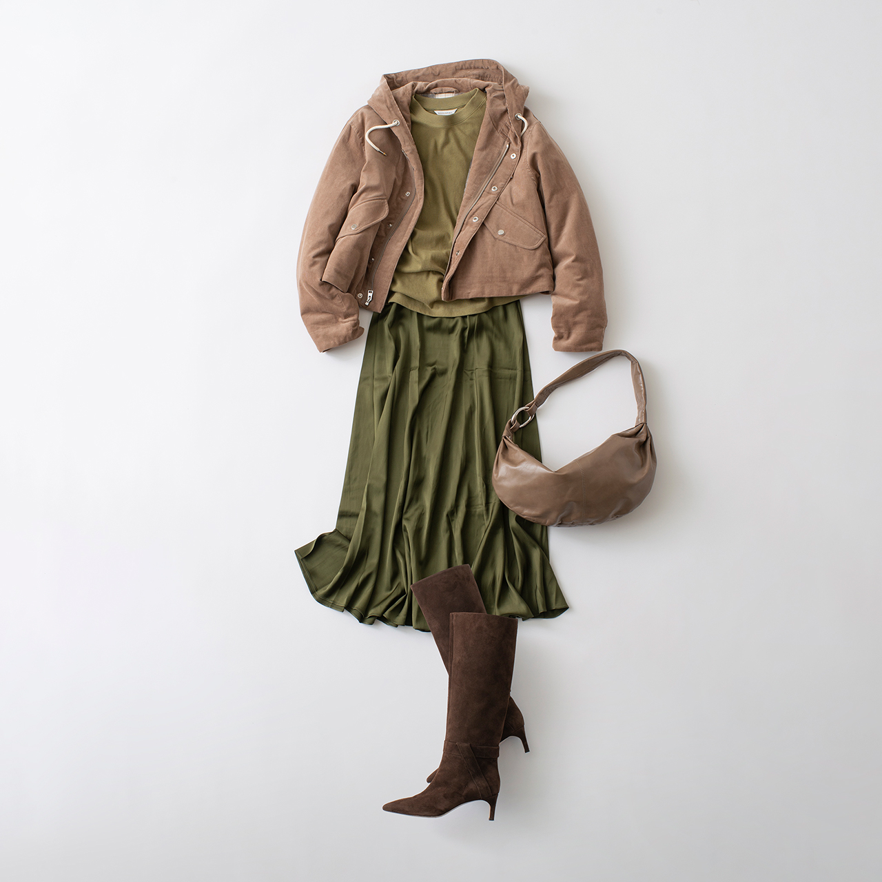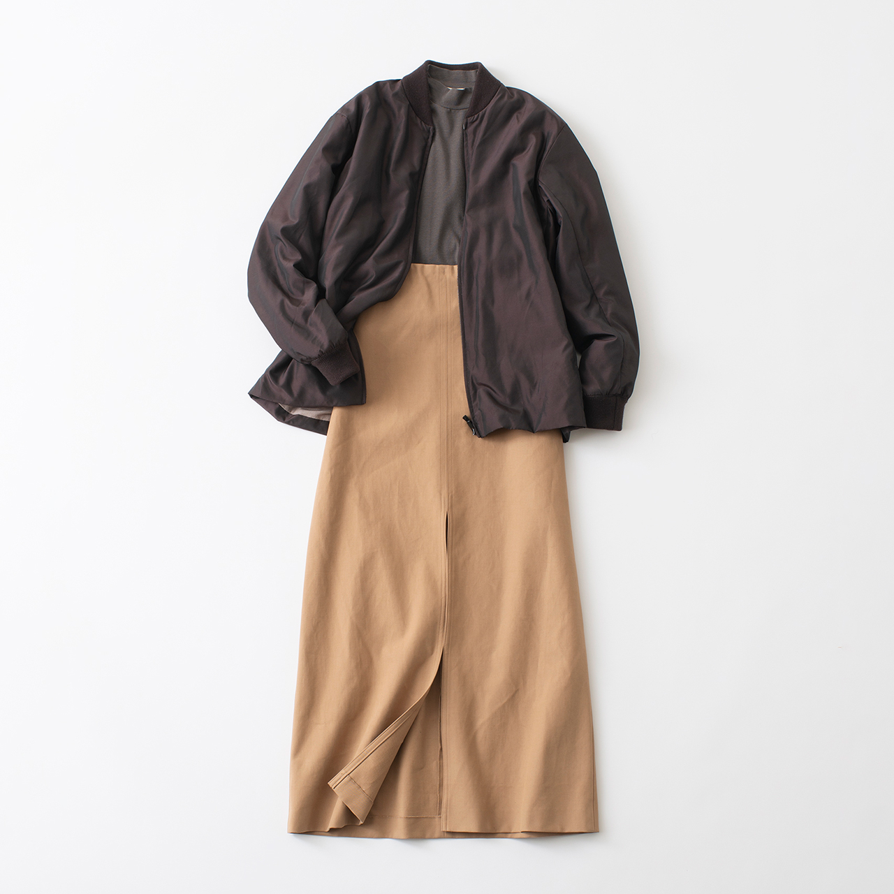 美しい光沢を放つシルクナイロンのブルゾン。大人はカジュアルなアイテムこそ、ラグジュアリーな生地感にこだわりたい。シックに秋色コーデでまとめて。ブルゾン¥176,000、トップ¥24,200、スカート¥82,500(以上オスロー/ソブ ダブルスタンダードクロージング/六本木ヒルズ ヒルサイドB1F)