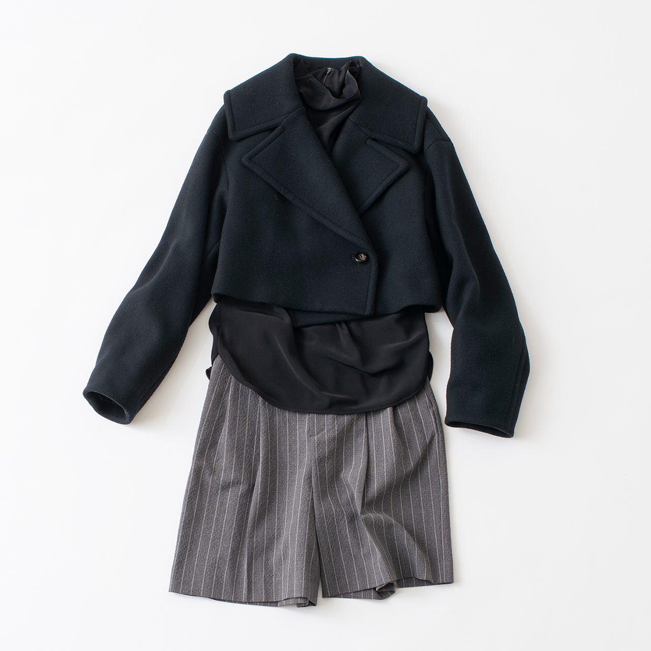 Pコートを切ったようなショート丈のジャケットコート。インナーを長めにしてレイヤー感を楽しみたい。ハーフパンツを合わせるなど、ボリュームのバランスと色のグラデーションでスタイリッシュに。コート¥71,500、プルオーバーブラウス¥39,800、ハーフパンツ¥38,500(以上ソブ/ソブ ダブルスタンダードクロージング/六本木ヒルズ ヒルサイドB1F))