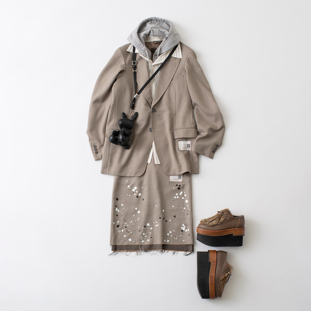 フーディーとシャツが一体化したメゾン ミハラヤスヒロのスーパーレイヤリングジャケット。ルーズなレイヤーの着こなしが苦手な人もこの一枚で達人に。キラキラディテールをあしらったフェミニンなスカートでエレガンスをプラスして。ジャケット¥115,500、スカート¥70,400、ラビットバッグ¥46,200、シューズ¥69,300(以上メゾン ミハラヤスヒロ/メゾン ミハラヤスヒロ トウキョウ/表参道ヒルズ 本館B1F)
