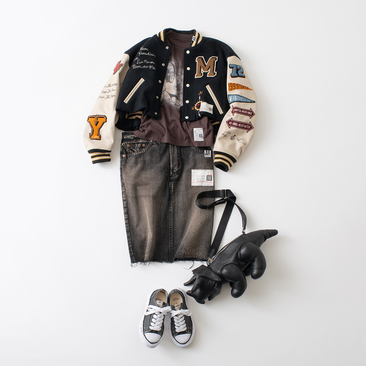 アップリケや刺繍がデザインされたショート丈のレターマンジャケット。いわゆるスタジャンですが、ショート丈を選ぶと今年らしさがアップ。スカートはウエストが二重になったトリッキーなデザイン。スカートは着用すると少しずり落ちたような絶妙なシルエットに。スタジアムジャンパー¥154,000、Tシャツ¥28,600、デニムスカート¥71,500、トリケラトプスバッグ¥104,500、スニーカー¥53,900(以上メゾン ミハラヤスヒロ/メゾン ミハラヤスヒロ トウキョウ/表参道ヒルズ 本館B1F)
