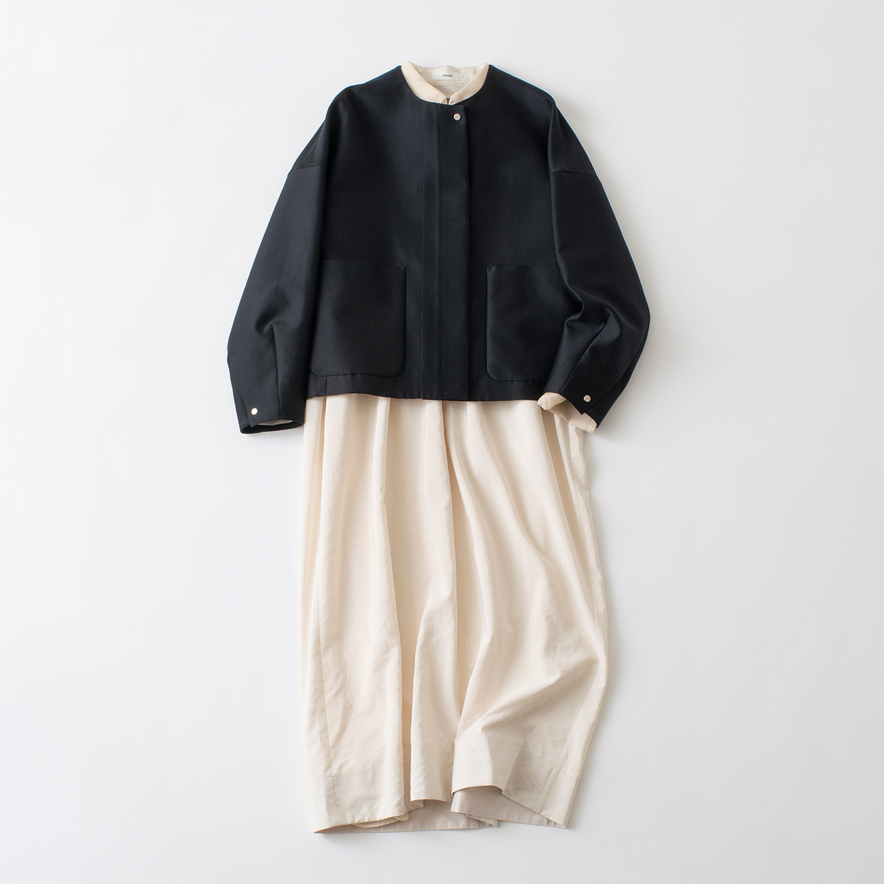 程よいボリュームを描くコクーンシルエットが美しいエブールのジャケット。ゆったりとしたワンピースの上にカーディガン感覚で羽織っても素敵。ジャケット¥80,300、ワンピース¥105,600(以上エブール/六本木ヒルズ ウェストウォーク3F)