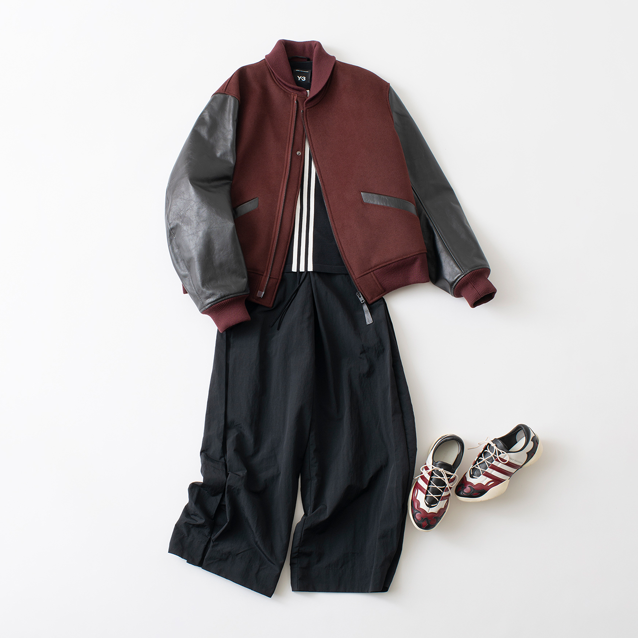 深みのあるワインレッドとレザーのコンビネーションがシックなY-3のレターマンジャケット(スタジャンとも)。バックサイドにはロゴのペイントが。レトロなスニーカーを足もとに、秋のスポーツミックスを楽しんで。レターマンジャケット¥192,500、ロングTシャツ¥37,400、パンツ¥44,000、スニーカー¥59,400(以上ワイスリー/表参道ヒルズ 本館B1F)
