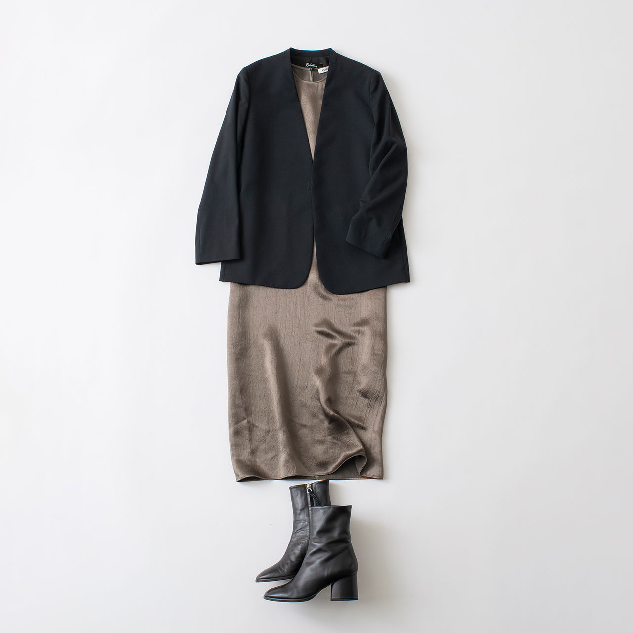 ボタンレスのシンプルで上品なノーカラージャケット。サテンのワンピースにさらりと羽織り、すっきりと着こなしたい。アクセサリーを足せば、パーティーなどの華やかな席にも対応できるコーディネート。ジャケット¥47,000、ワンピース¥19,800(ともにエディション)、ブーツ¥116,600(エイディー/以上エディション/表参道ヒルズ 本館2F)
