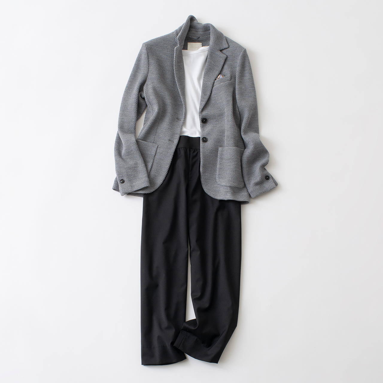 立体的な素材感が目を引くジャケット。カジュアルできれいめに着こなすシンプルなコーディネートも、マテリアルにこだわることでさらにおしゃれ度がアップします。ジャケット¥91,300(チルコロ1901)、Tシャツ¥11,000(スリードッツ)、パンツ¥24,200(エム・フィル/以上ビームス/六本木ヒルズ ウェストウォーク2F・3F)