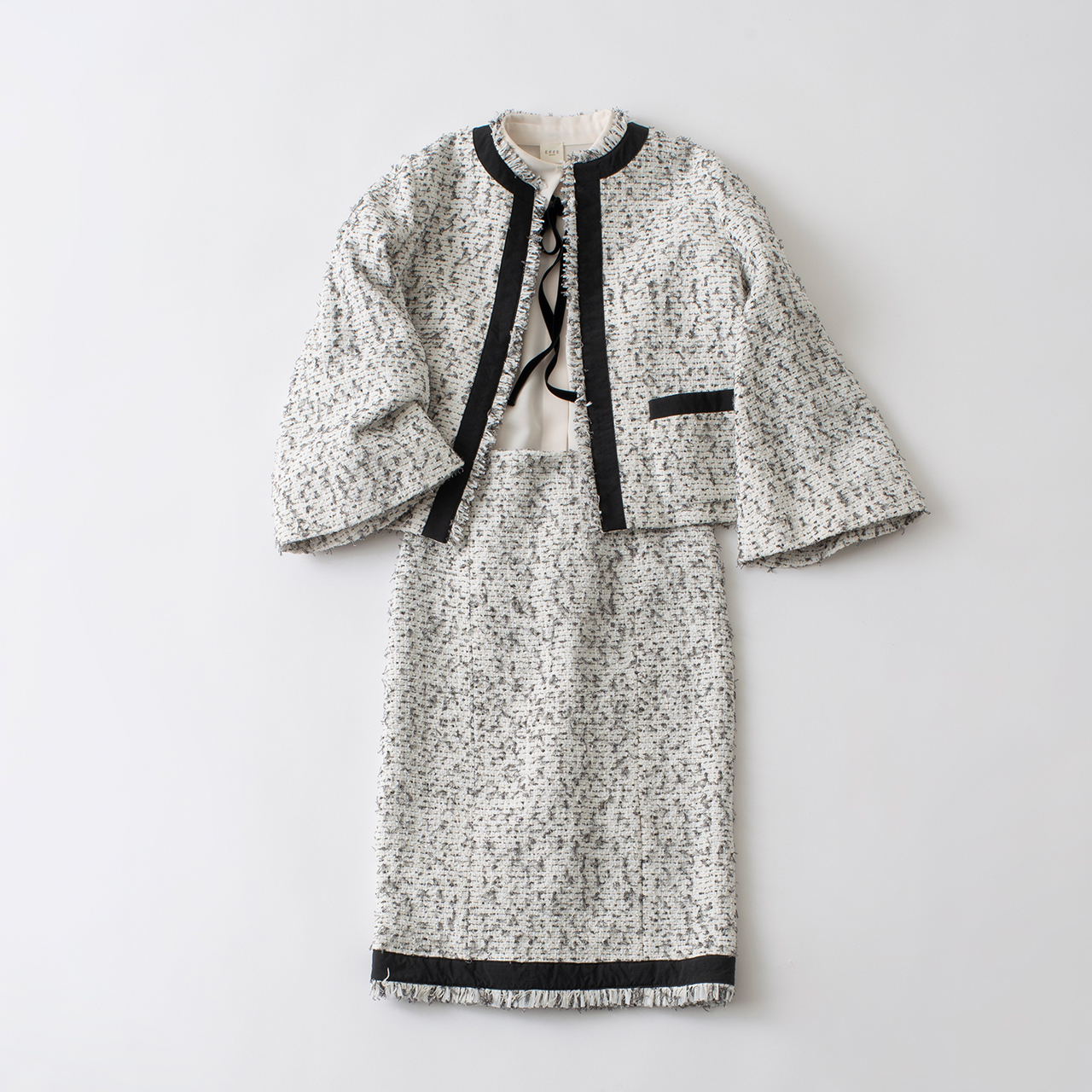 トランペットスリーブが印象的なツイードのジャケット。セットアップで持っていると、華やかなパーティーからカジュアルな日常まで色々と活躍する一着。ジャケット¥71,500、ブラウス¥36,300、スカート¥39,600(以上エッフェ ビームス/ビームス/六本木ヒルズ ウェストウォーク2F・3F)
