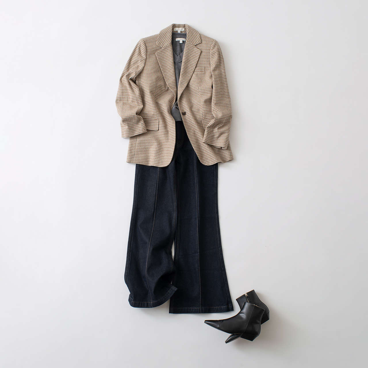 チェック柄のベージュ系ジャケットは秋の定番。Vネックニットとデニムのトラッドなスタイルなら、足もとは尖ったブーツで。一枚持っていると幅広いスタイルを楽しめます。ジャケット¥42,000、Vネックトップ¥16,000、パンツ¥18,000、ブーツ¥45,000(以上バナナ・リパブリック/虎ノ門ヒルズ グラスロックB2F)