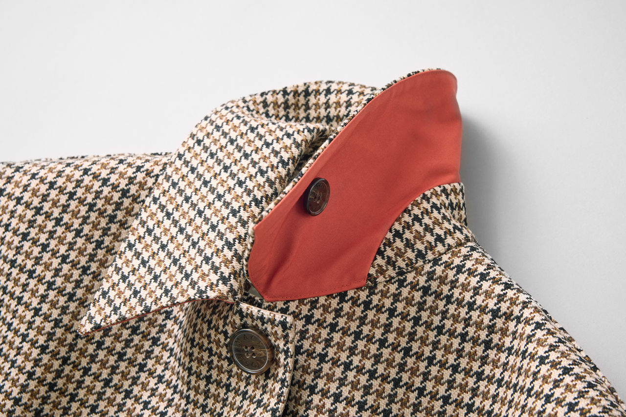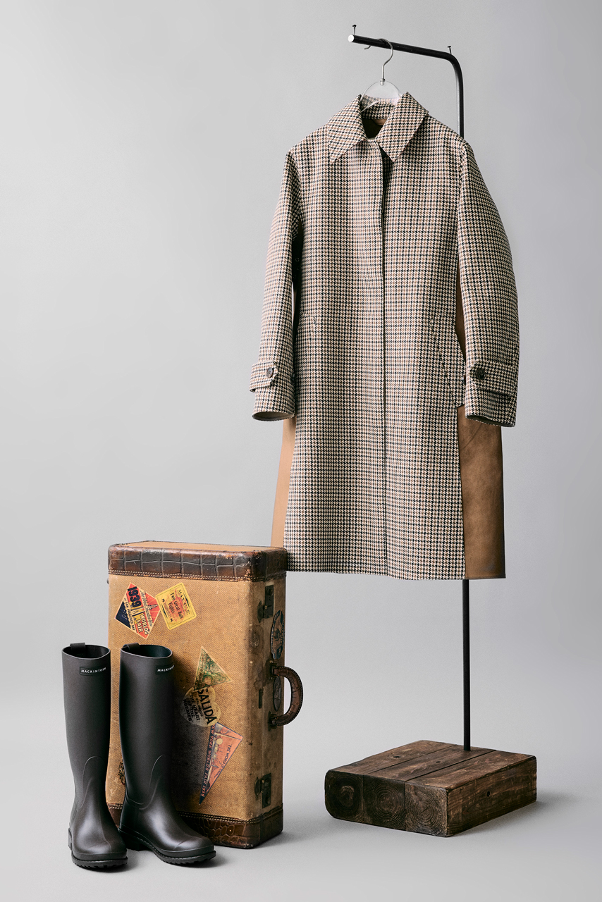 1823年創業の英国ブランド、マッキントッシュ。美しいコート作りを得意とするこのブランドの定番人気モデル「バントン」から新作のハウンドトゥース柄コートをチョイスした矢内さん。「トラッドでありながら、サイドの切り替えやチラッとのぞくビビッドなオレンジの裏地がモダンな印象。Aラインシルエットでマニッシュすぎないのもいいですね。表面は上質感のあるウール、内側がゴム引きコットンになっているので風を通さずしっかり暖か。雨の日も安心で、レインブーツとともにぜひ持っていたいアイテムです」