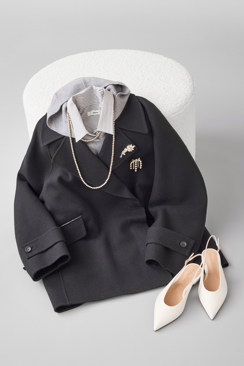 ジャケットとコートの中間を意味する「ジャコット」が、きれいめカジュアルの先鋒・エブールで大人気との情報をキャッチ。「ジャケットとコートのいいとこ取りの“ジャコット”。こちらはエブールらしい上質なラムウール素材に、大きめの襟やポケットのレザートリミングが効いています。シャツにカシミア素材のフードニットを重ねた上からざっくり羽織って、きちんと感がありつつリラックスムード漂うスタイリングに。ブローチやポインテッドトゥといった華やかな小物もよく似合います」
