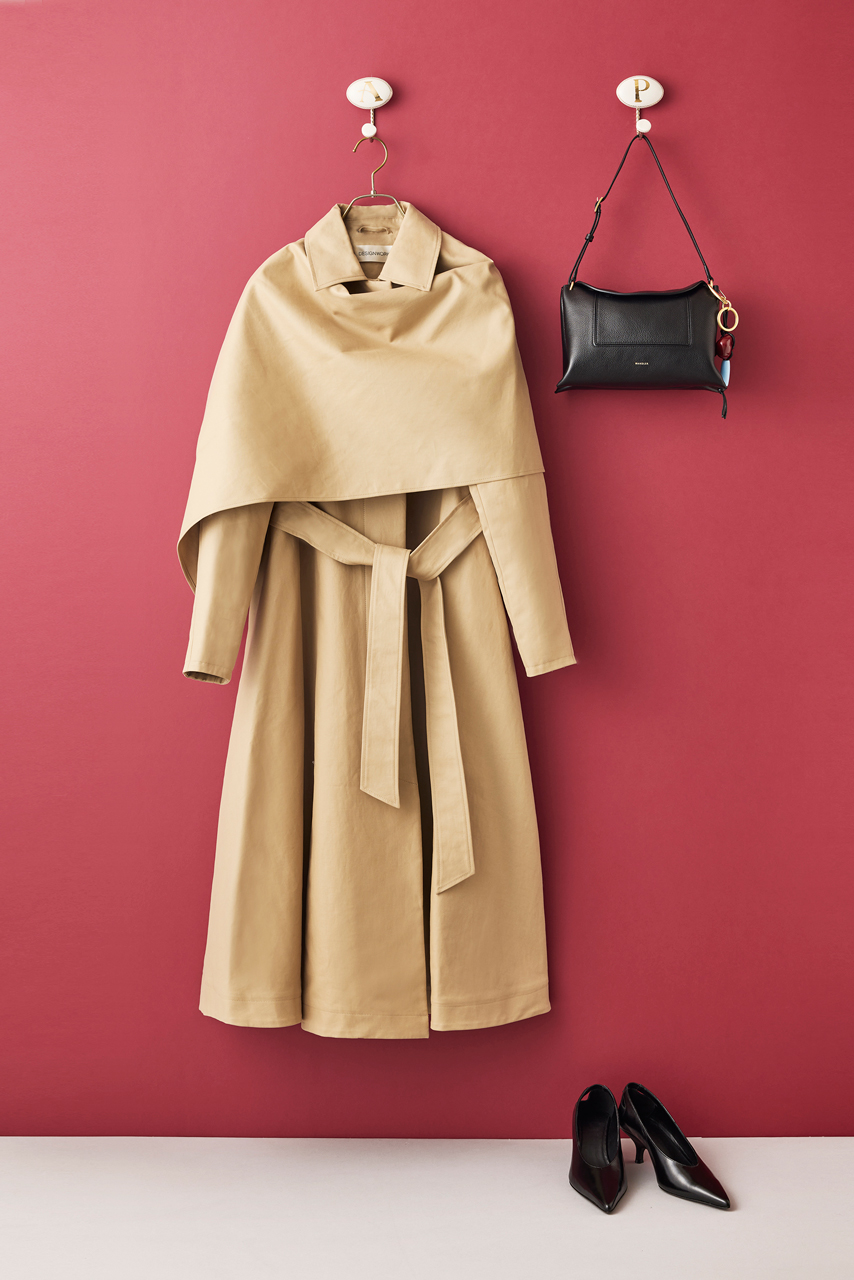 エッジが効いたセレクトでファッション通の支持を集めるデザインワークスで見つけたデザイントレンチ。「共布のケープがポイントで、マントのように巻くとエレガント。片方だけについたエポレットにケープを通して垂らすとスタイリッシュな印象に。ケープを外すと裾に向かって広がるシルエットが強調され、ドレスっぽく着ることができます。何通りもの着こなしができて、おしゃれ心を刺激するデザインワークスらしいコート。真冬にはインに暖かなニットを着込んで、春先にはスプリングコートとして、長く楽しめそうな1枚ですね」