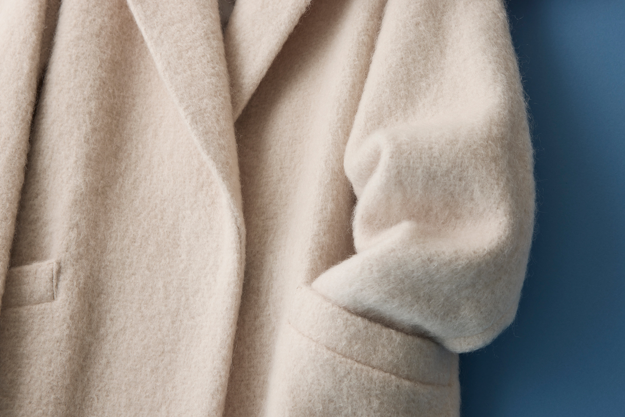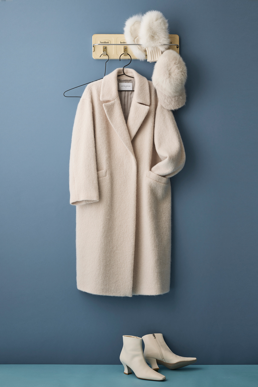 上品なトレンドアイテムが揃うユナイテッドアローズで毎年人気のテーラードコートから、オフホワイトを選んだ矢内さん。「エレガントな膝下丈もオフホワイトなら軽やかな印象。比翼仕立てのミニマルなフロントデザインですっきり着ることができ、ドロップショルダーと大きめの襟が顔まわりを華奢に見せてくれます。今回はモヘヤ混のふわふわ柔らかな雰囲気を活かして、同じ質感のキャップやミトンで愛らしさを強調しました。落ち感のあるスラックスなどを合わせてシャープな印象にシフトするのも素敵です」