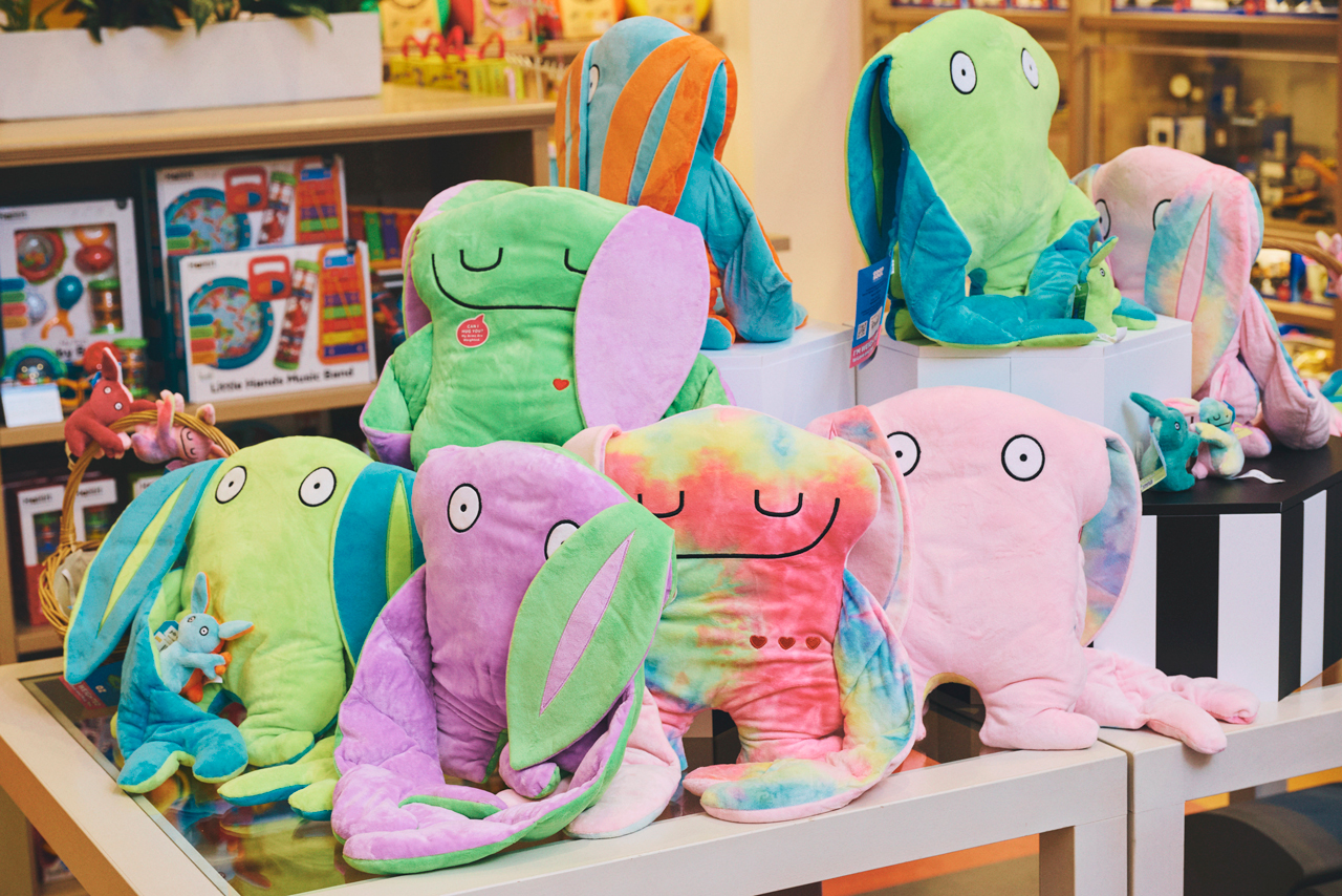 六本木ヒルズ ヒルサイド B2Fの〈ボーネルンド〉を訪れた宮本さん親子。カラフルなあそび道具が並ぶお店を前に、テンションが上がります。