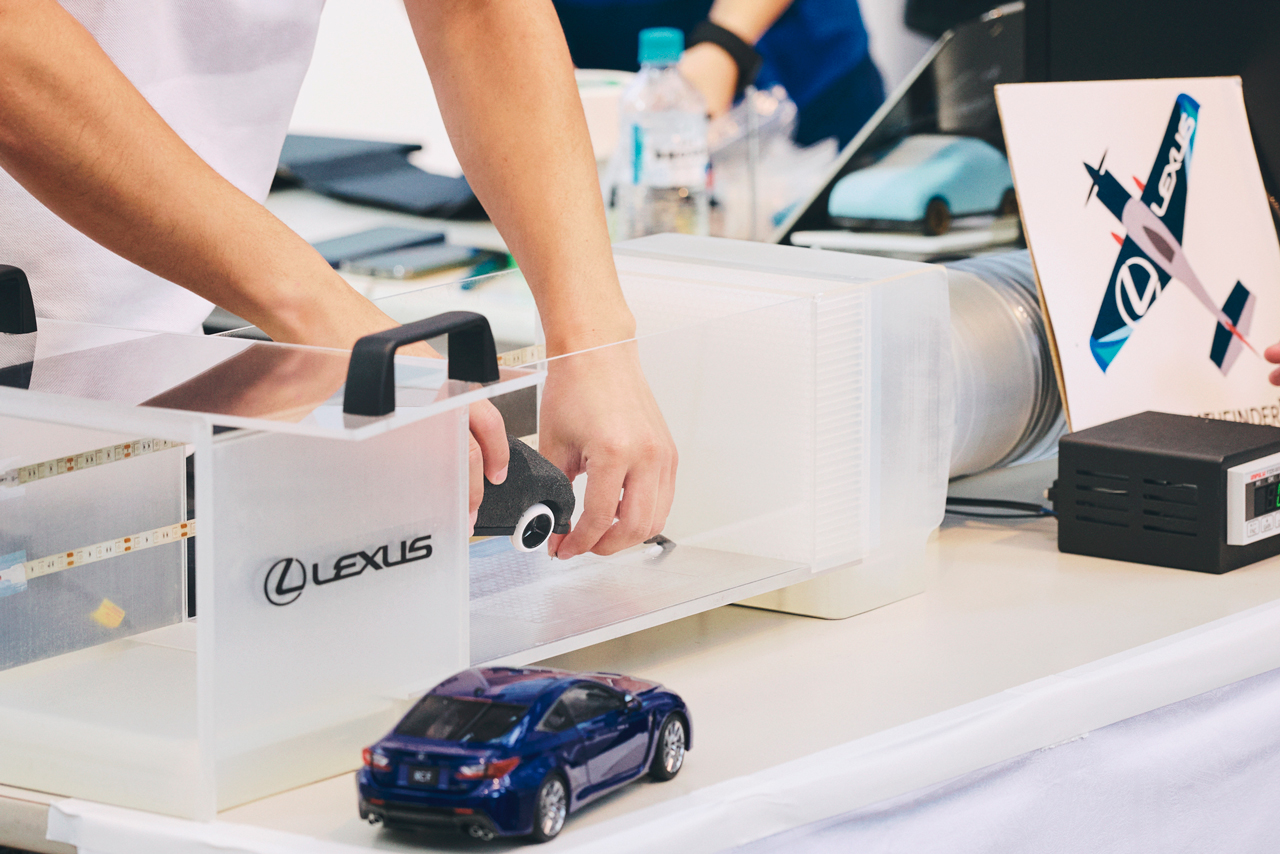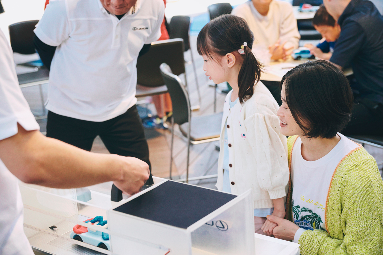 次に訪れたのは、「レクサス」と〈ボーネルンド〉のコラボワークショップ。「レクサス」の技術チームが講師となり、空気抵抗やものを動かす仕組みについて学びます。