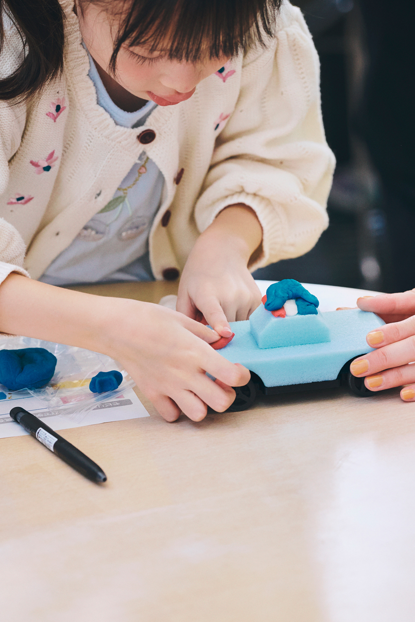車輪付きの土台に粘土を貼り付け、自分だけの車をデザインします。