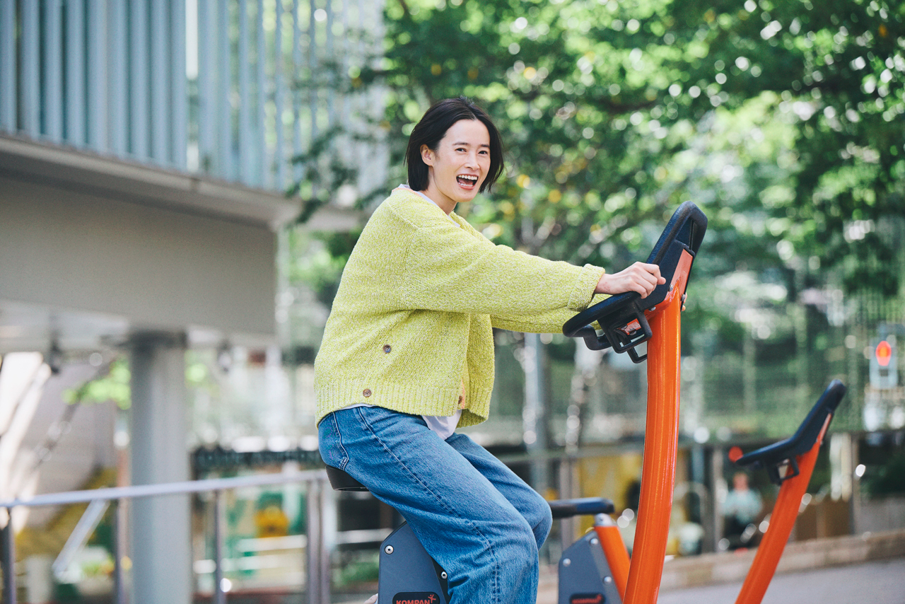 大人向けコンディショニングにも力を入れる〈ボーネルンド〉。デンマーク・コンパン社のアウトドアフィットネス(バイク)を宮本さんが試乗体験しました。