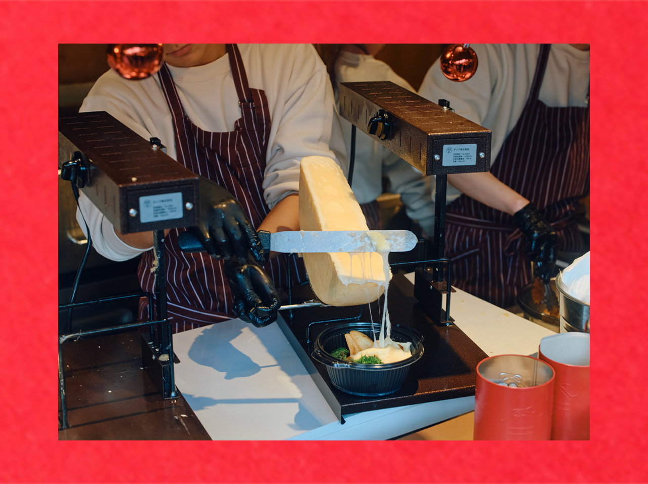 麻布台ヒルズにある、三國清三氏プロデュースのグランビストロ「ダイニング 33」からは、溶けたラクレットチーズを目の前でかけて仕上げる「とろけるラクレットチーズと冬野菜&ソーセージのグリル」(¥1,800)。チーズの香ばしさがたまらない。