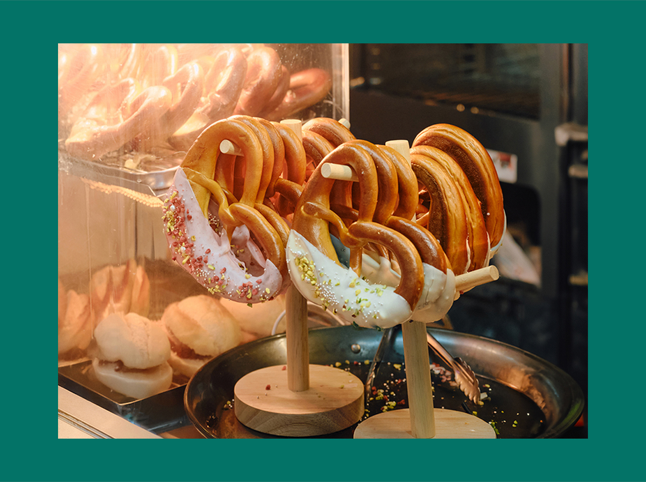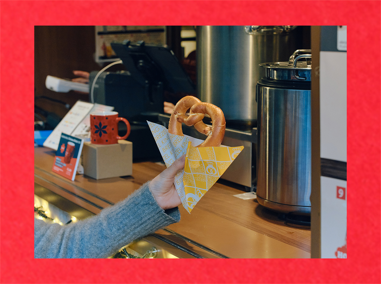 ドイツ産・発酵バター入りプレッツェルの専門店「プレッツェルキング」は、「ジャーマンクリスマススタンド」の姉妹店。チーズやハムをのせたお食事タイプと、メープルシナモンシュガーをかけたデザートタイプが、アップルグリューワインやビールと一緒に楽しめる。