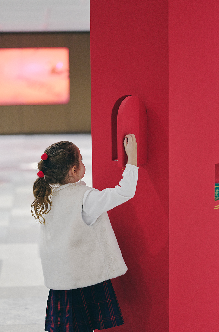 壁面の側部には扉を設け、開閉にあわせて内部の「くるり子」が動き出す。さまざまな高さに窓を設けているので、体格や世代によって目が向く箇所も異なる。
