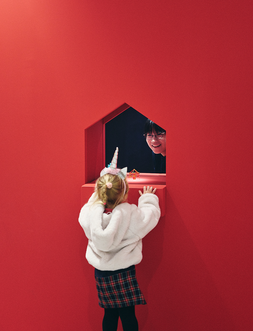 三澤 作っていくうちに、結果として25窓を用意することになりました。ツリーをモチーフとする窓だけで3つもありますが、それぞれに表現は異なります。一つひとつのメッセージはとても小さなものですが、それらが集うことで伝わるものがあるように思います。まるでハーモニーのように響き合っているイメージで捉えていただけたら。外国の方々が「Shall We Cha Cha Cha?」と読み上げてくださっていて、声に出したくなるリズムでもあるなと思いました。大きな展示にも憧れますが、今回はやはりこの小さなサイズであることに意味を感じます。たとえばライティングの効果、音と連動して動くことなどを感知した時に、人々はもっと心惹かれるのではないでしょうか。展示のなかにはとても小さな「くるり子」もいて、この世界にも大小があります。私はそもそも一人旅が好きで、こっそり、ひっそり、静かにボーッと展示を見ることが好き。ですから一人で静かに見ているイメージが、私は常に頭のなかにあるのです。
