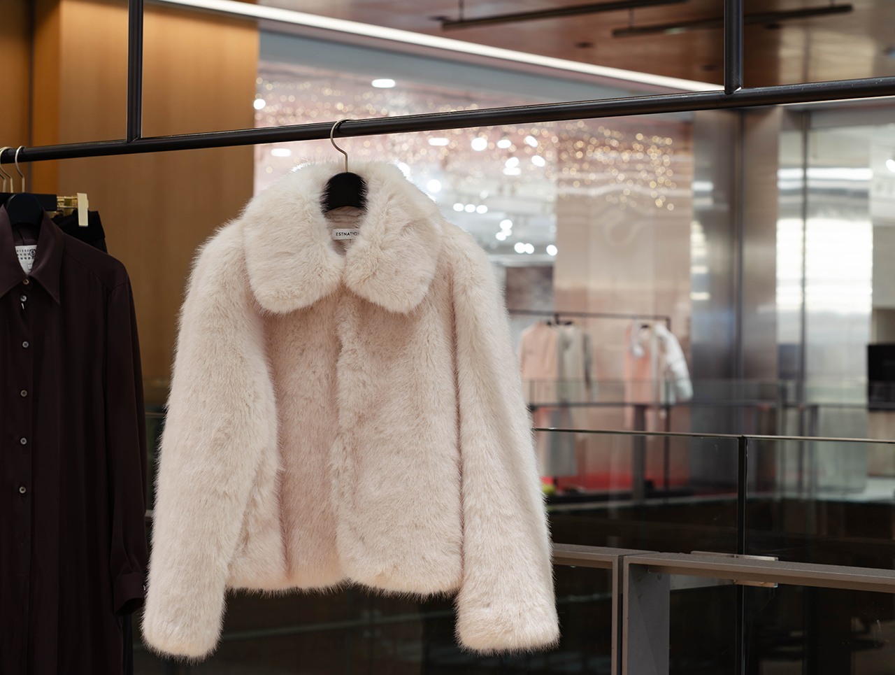 続いてホリデー仕様の華やかなディスプレイが目をひく六本木ヒルズの〈エストネーション〉を訪れた佐藤さん。まずはエコファーのジャケットをセレクトしました。「これ1枚でホリデーっぽさが出るファーのアウターはこの時期ぜひ持っていたいアイテム。ドレスにももちろん合いますし、スウェットパンツやレギンスと合わせてカジュアルに着るのも素敵。アウターで明るい色を取り入れることが多いのですが、特に冬の白アウターは可愛くて好きです」