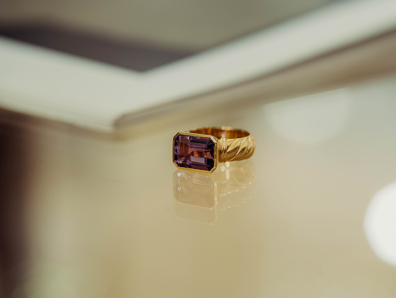 ジュエリー売り場も充実していることで知られる〈エストネーション〉。今年8月にローンチしたジュエリーブランド・vveerからチョイスしました。「大ぶりの色石にアンティーク風のデザインが素敵ですね。いくつか石がある中でもキャンディのようにきれいな紫色に惹かれて選んだのですが、後で聞いたらアメジストだそうで。自分の誕生石を無意識に選んでいたようで驚きました。一年の締めくくりに、自分へのプレゼントにしたいですね」