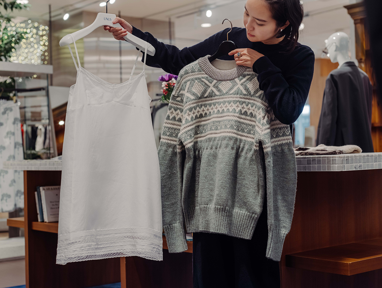 ラグジュアリーなデイリーウェアを発信するブランド・UNUS(ユナス)のコーナーで、レース付きのキャミソールワンピースに一目惚れした佐藤さん。「自宅でくつろぐ時、こんな可愛いワンピースなら気分が上がりそう。あとはニットを上に着てホームパーティに出かけたり、デニムを合わせてデイリーに着たいです。クリスマスシーズンにはノルディック柄にキラキラしたシルバーラメがついたニットを合わせたいですね」