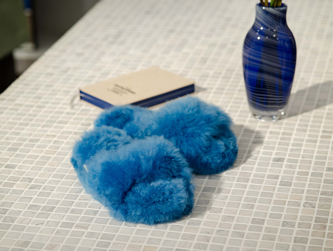 鮮やかなブルーとたっぷりボリュームのあるファーがインパクト絶大なスリッパを発見。「リアルファーを使った贅沢なスリッパは、とにかく肌触りが良くて癒されます。色も素敵だし、しかも汚れが目立たなさそう。自然に命を終えたアルパカの毛皮を再利用していると聞いて、そういうところもいいなと感じました。ホリデーシーズンにはギフトを贈る機会も多いですが、お世話になった人や友人へのプレゼントにも良さそうです」