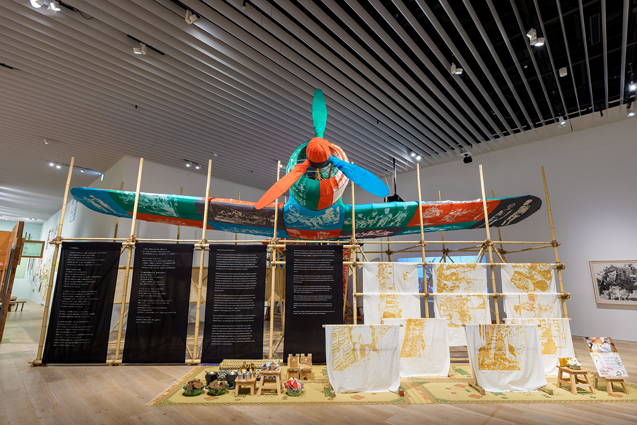 矢作 展示している《フラジャイル・ギフト・ファクトリー》(2025)は2021年から続く北澤さんの長期プロジェクト「フラジャイル・ギフト」から派生した最新作です。このプロジェクトは、北澤さんがジャカルタの空軍博物館で戦闘機「隼(中島キ43)」が保存されているのを発見したことがきっかけでスタート。今回の展示は、現地の職人たちと一緒に考えながら、竹や手染めの布などの素材でその戦闘機を実物大の凧として再構築したものです。あの戦闘機の作品を持ってくると決めた時に、実際どうやって置くかというのはかなり議論をしました。館内のルールの一つとして、大きいものをつるすとその下に何も置けないんです。作家としては飛んでいる風景を見せたいので吊るしたかった。でも、そうすると何も使えないゾーンが出てきてしまう。何か考えられないかというので、竹で足場を組んで整備工場として見せる、という案が出てきた。とても柔軟に取り組んでくれたんですね。なので、作品制作にまつわる素材なども展示することができ、また、作品の下のベンチに座って記録映像を見ることもできます。