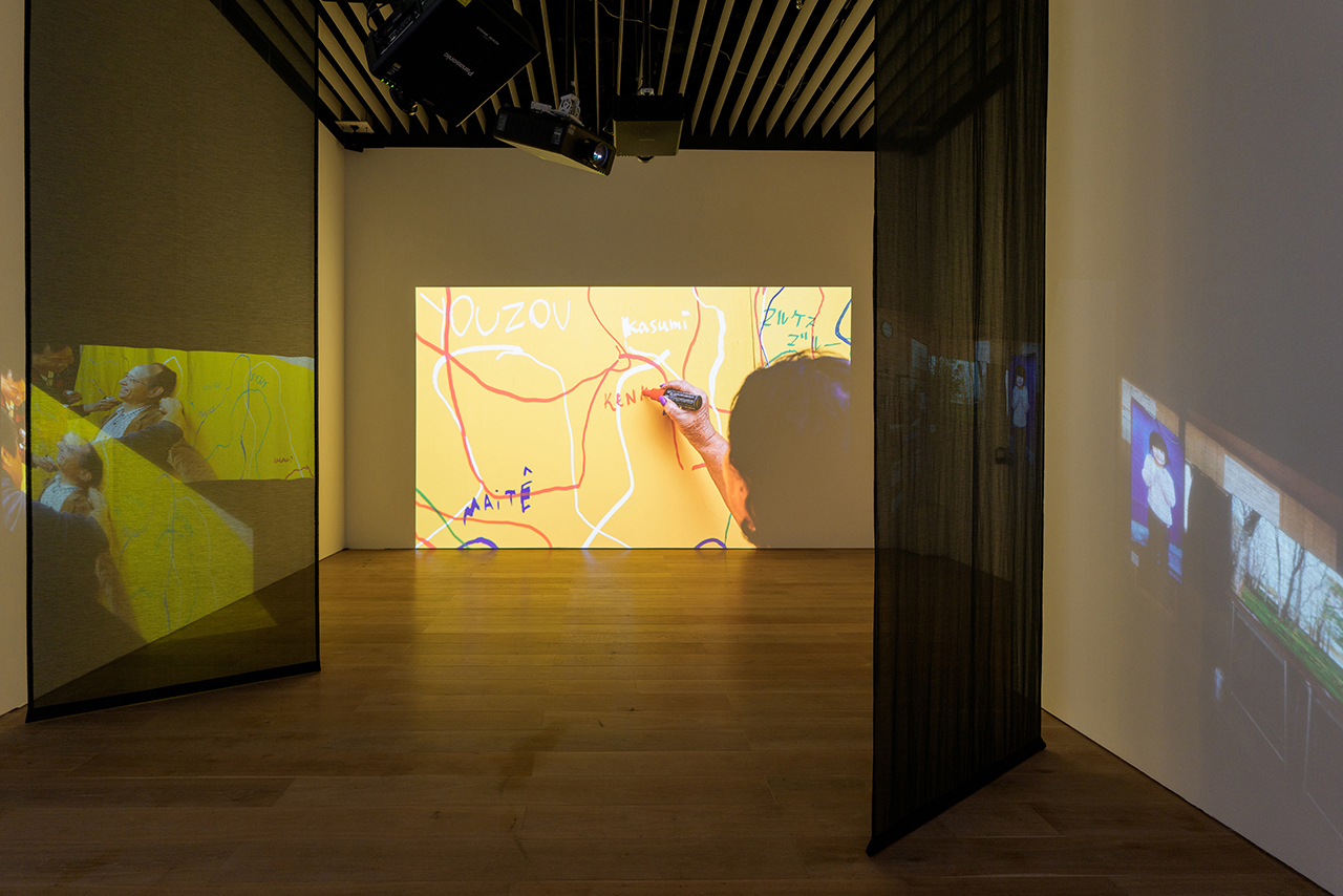 2025年11月1日〜2日に開催された「Knots Art Festival at サンタナ学園」の記録映像をもとに構成したインスタレーション。金仁淑《Eye to Eye, Side:E, 森美術館 Ver.》2025年 展示風景:「六本木クロッシング 2025 展:時間は過ぎ去る わたしたちは永遠」森美術館(東京)2025-2026年 撮影:竹久直樹 画像提供:森美術館(東京)