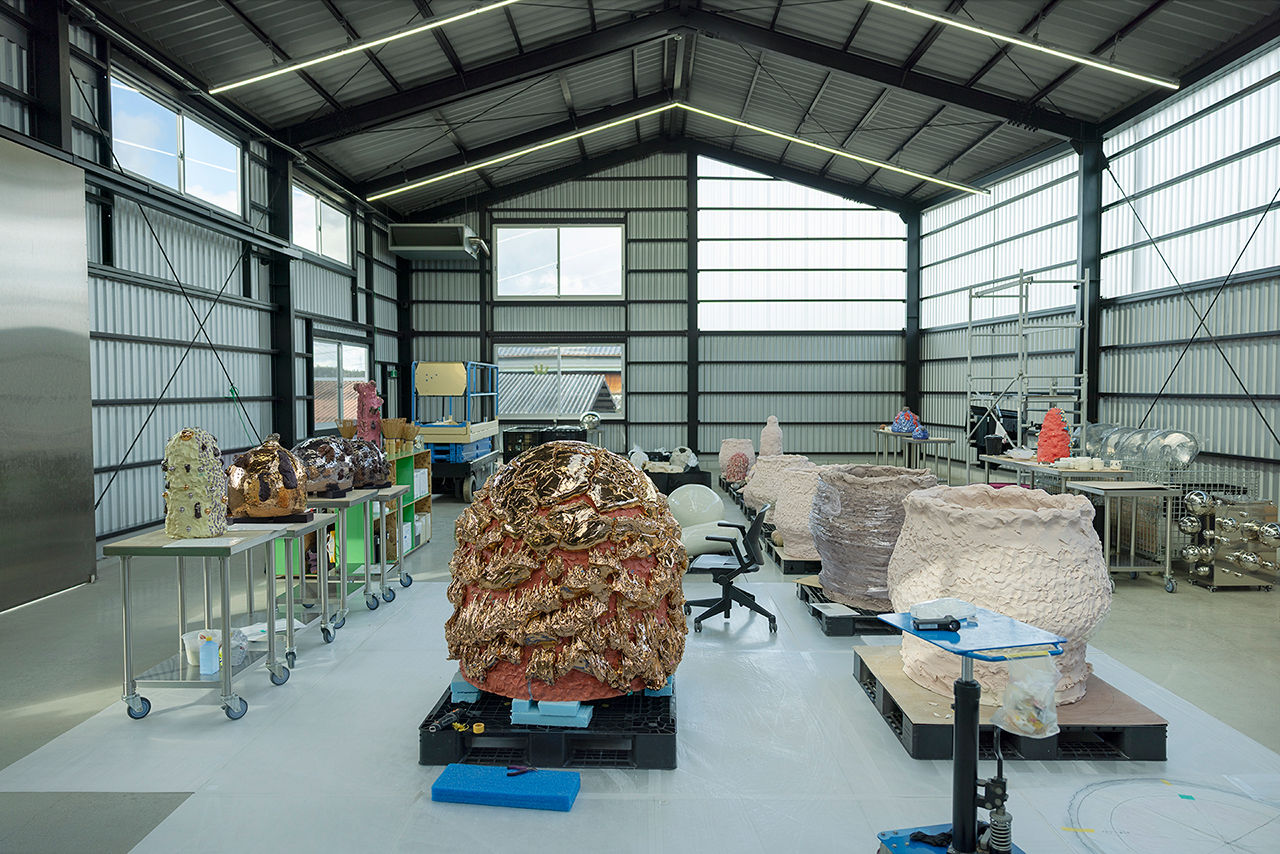 窯業の町として長い歴史がある岐阜県多治見市。かつては1日5,000個もの飯茶碗を生産していた工場が廃業し、その建屋を受け継いで自らの設計のもと、5年ほど前にフルリノベーションしたのが現在の桑田卓郎さんの仕事場だ。1,500坪もの広い敷地内に作業場や倉庫、オフィスなど幾つかの棟が分散して経っている。作業場は大型作品を作るにも天井高は十分で、巨大な電気炉が3つ並んでいる。