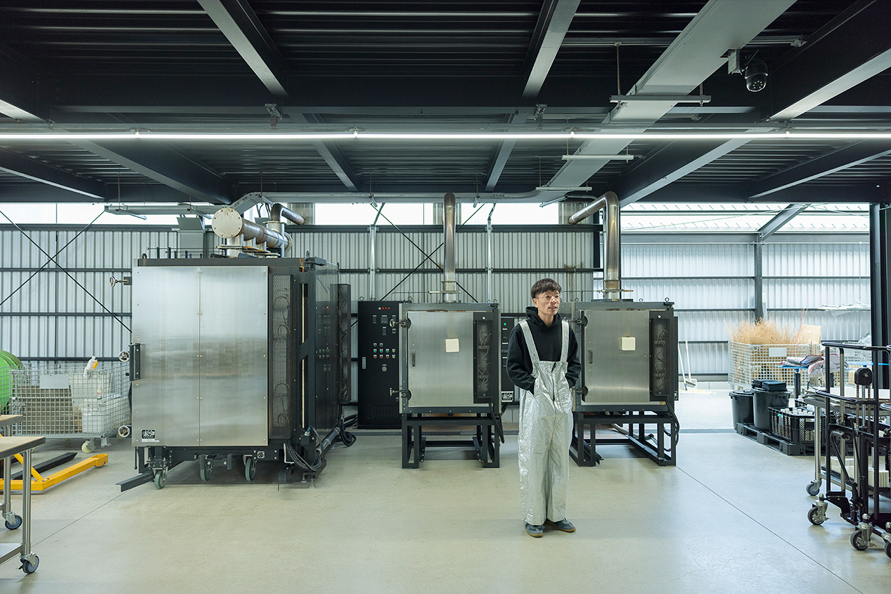 大型作品を焼くための電気炉。思い通りのテクスチャーに焼くために炉壁を薄くするなど工夫が凝らされている。桑田さんが着ているのは、ニューヨークを拠点に活躍するファッションデザイナー、大丸隆平さんに作ってもらったタイベック(高密度ポリエチレン製不織布)素材のオーバーオール。紙のような質感で軽く、強度がある。