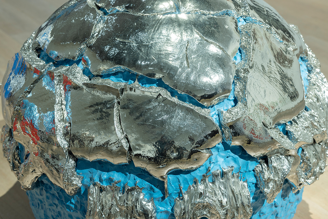 森美術館で展示中の《無題》(2025)の部分。ブルーの素地の上にかけた分厚い銀色の釉薬が焼いている間にちぢれてひび割れた「かいらぎ」の様子を意図的に制作している。
