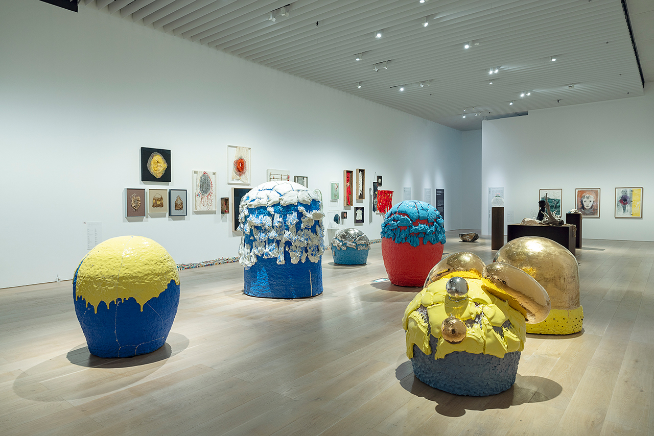 森美術館で展示中の作品《無題》(2021)※手前。黄色い部分に、本来は偶然に起こる「石はぜ」をコントロールして出している。