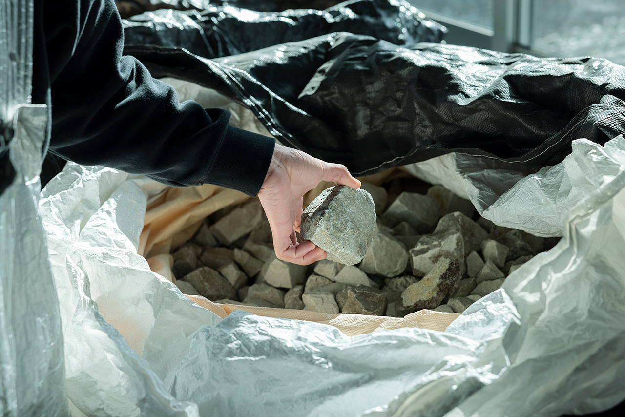 業者から譲ってもらった、デッドストックの長石。粉砕する前の大きいサイズは日本では手に入りにくいので貴重。これを釉薬にするのではなく、作品の表面にくっつけて焼くという。