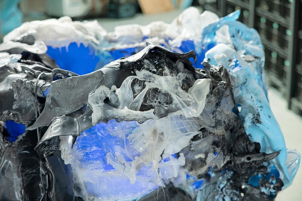 オーダーを受けて作ったプラスチックのプランター。青い巨大なバケツをベースに、表面にさまざまなプラスチック製品を溶かしてくっつけた。