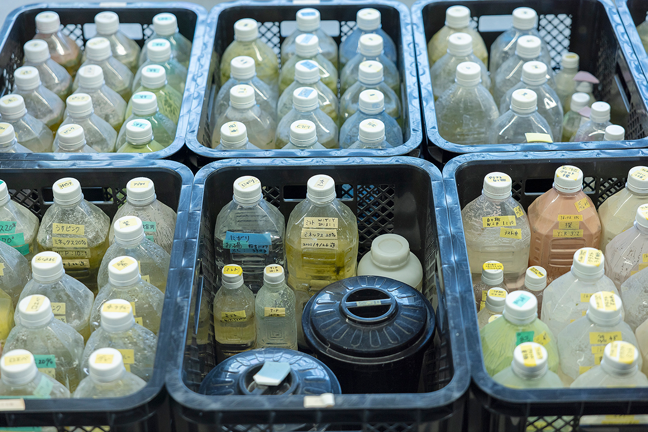 カップなどプロダクトのために使う鮮やかな色の釉薬。レシピに従えばスタッフの誰でも調合できるようにしている。