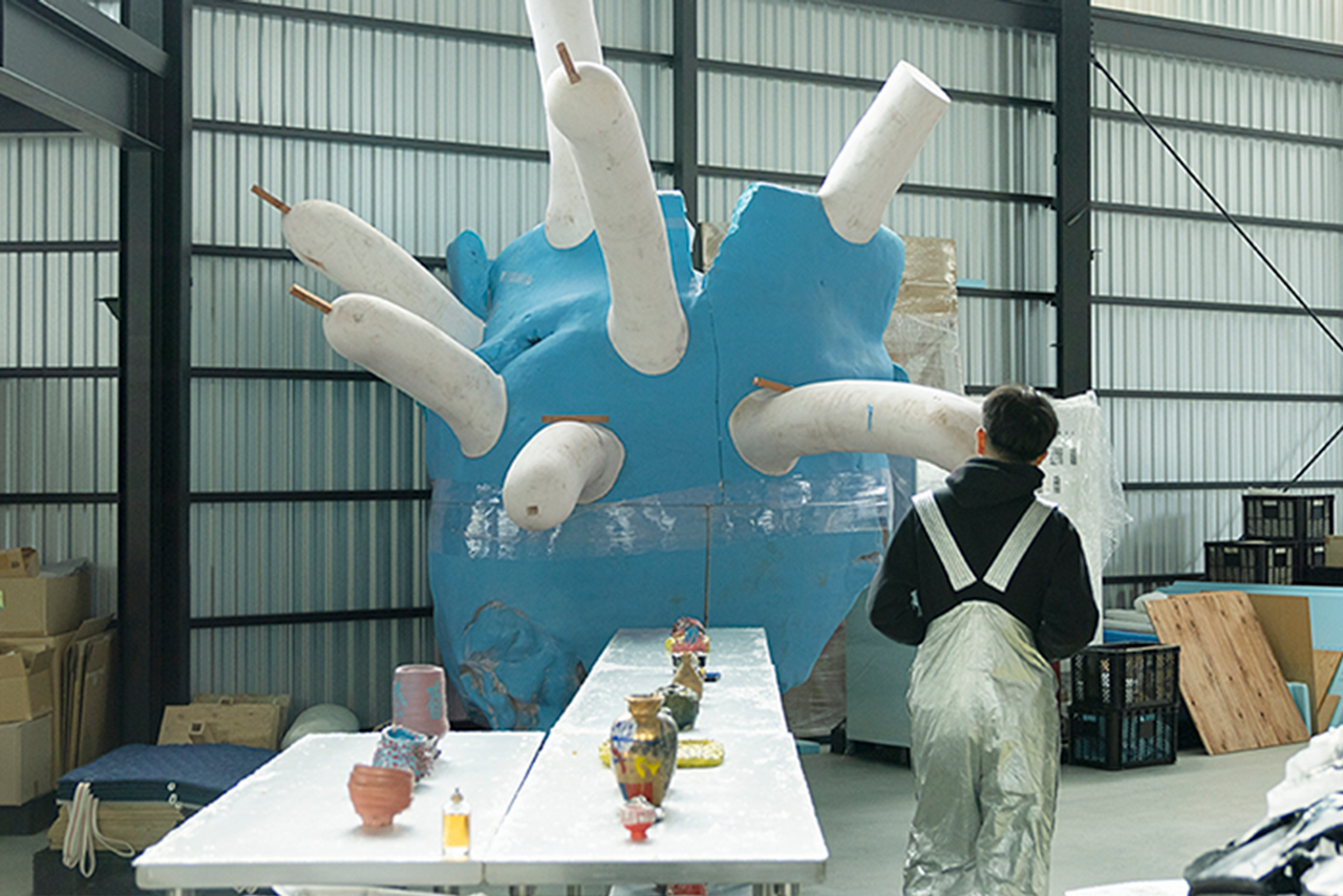 森美術館で開催中の「六本木クロッシング2025展」に、ひときわ目をひくビビッドな色彩とサイズ感の陶芸作品を出展した桑田卓郎さん。岐阜県多治見市に構える制作アトリエを訪ねて話を聞きました。